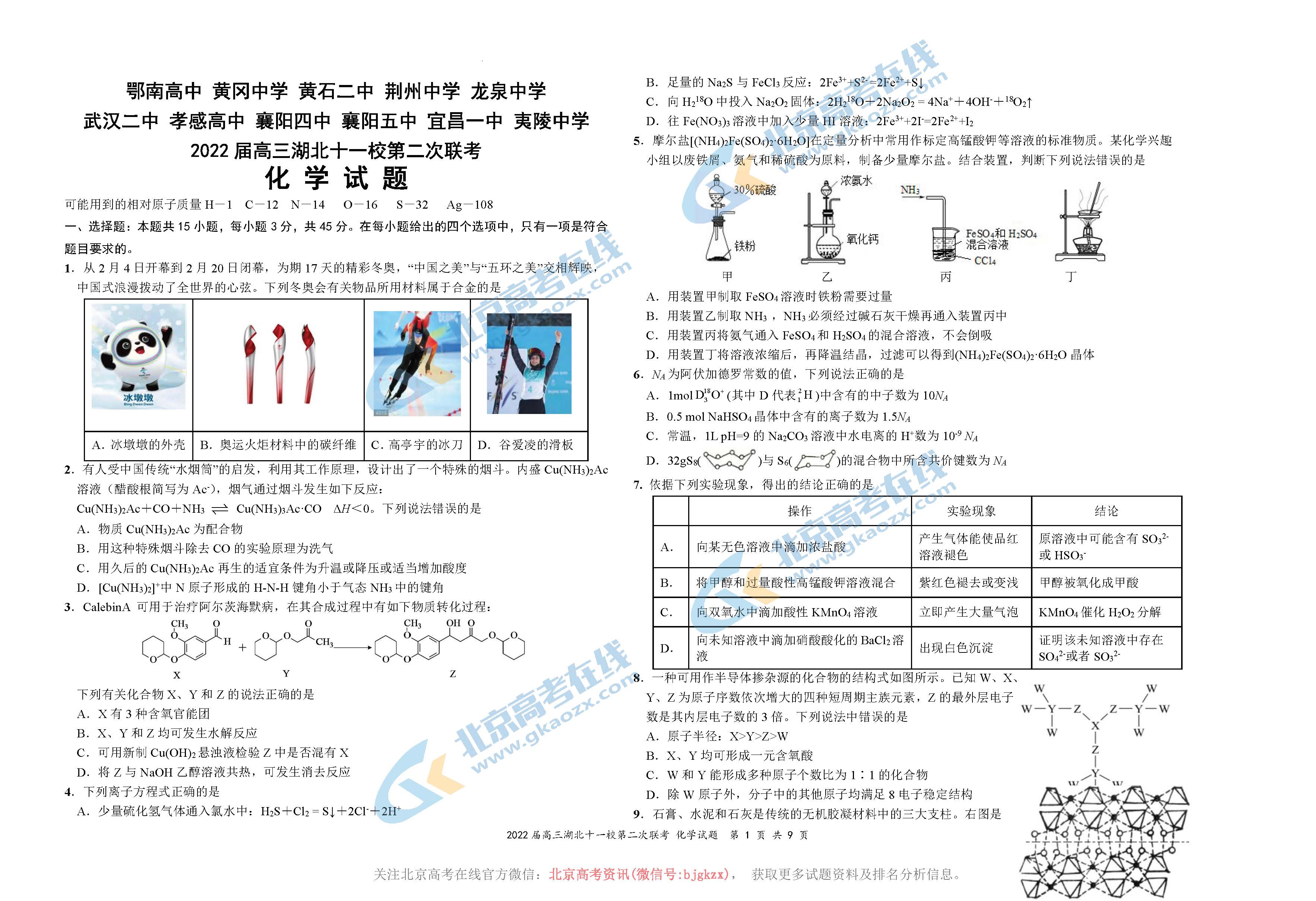 本文整理了2022年湖北十一校高三二次联考化学试题及答案,想要练习十一校二次联考试题的考生可以关注。3月30日,湖北十一校二次联考开考,目前所有科目考试已经结束。北京高考在线团队收集了此次湖北十一校二次联考化学科目试题及答案,想要练习的考生可以下载。