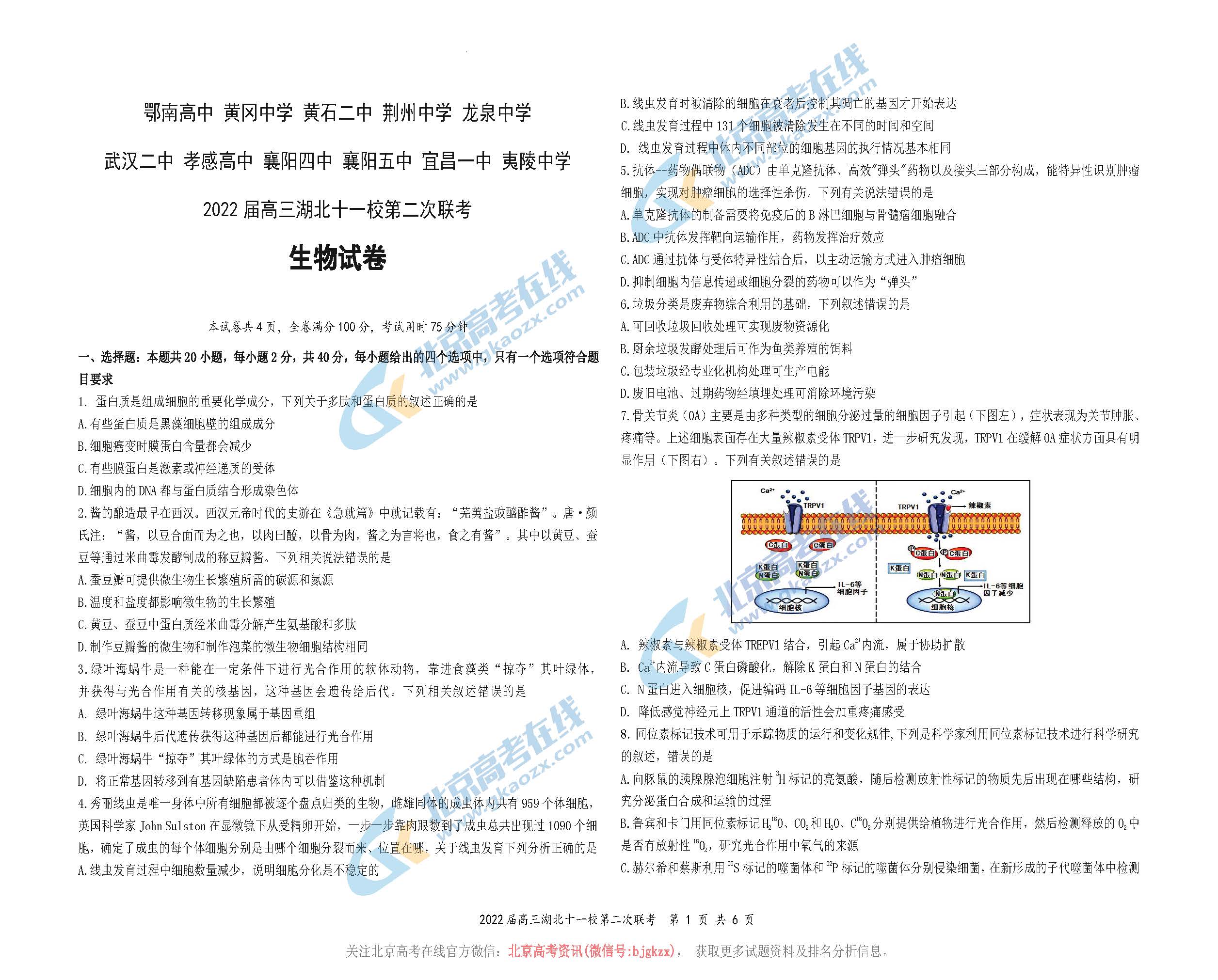 2022年湖北十一校高三二次联考生物试题及答案出炉,此外其他各科试题也可以下载啦,想要下载湖北十一校二次联考的考生重点关注。3月30日,湖北十一校二次联考开考,目前所有科目考试已经结束。北京高考在线团队收集了此次湖北十一校二次联考生物科目试题及答案,想要练习的考生可以下载。