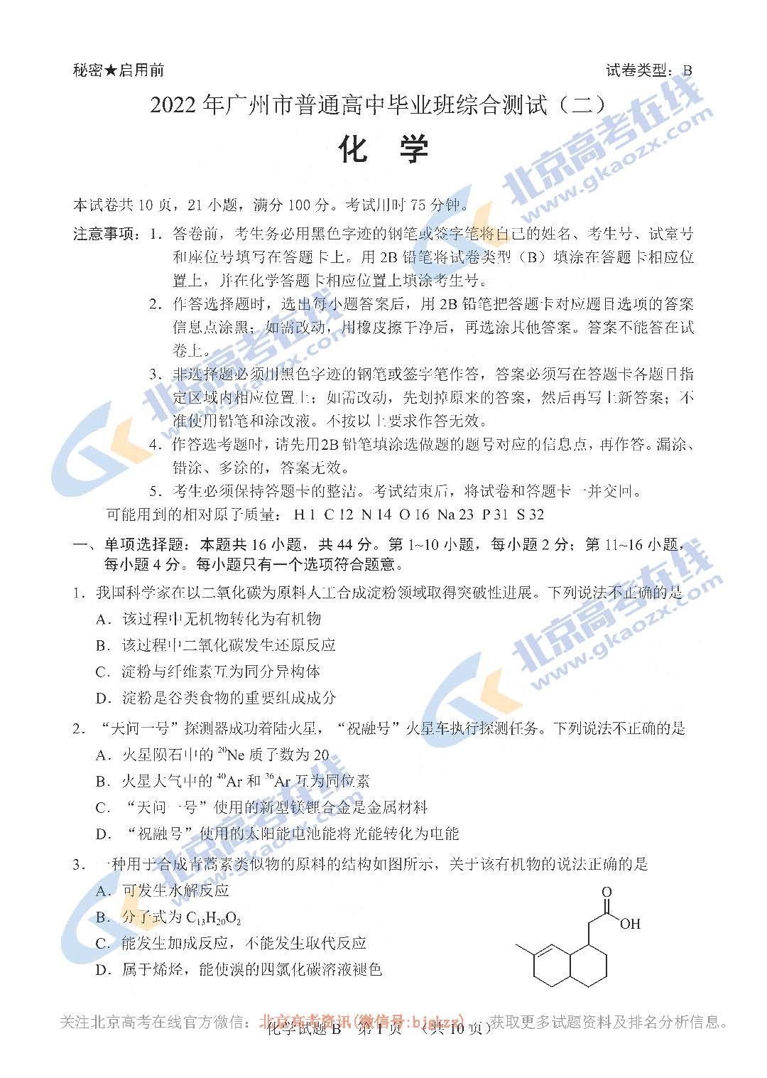 2022年广州二模4月20日已开考,化学科目考试已经结束。下面,北京高考在线团队整理了“2022年广州二模化学试题及答案”,想要练习的考生可以下载学习。