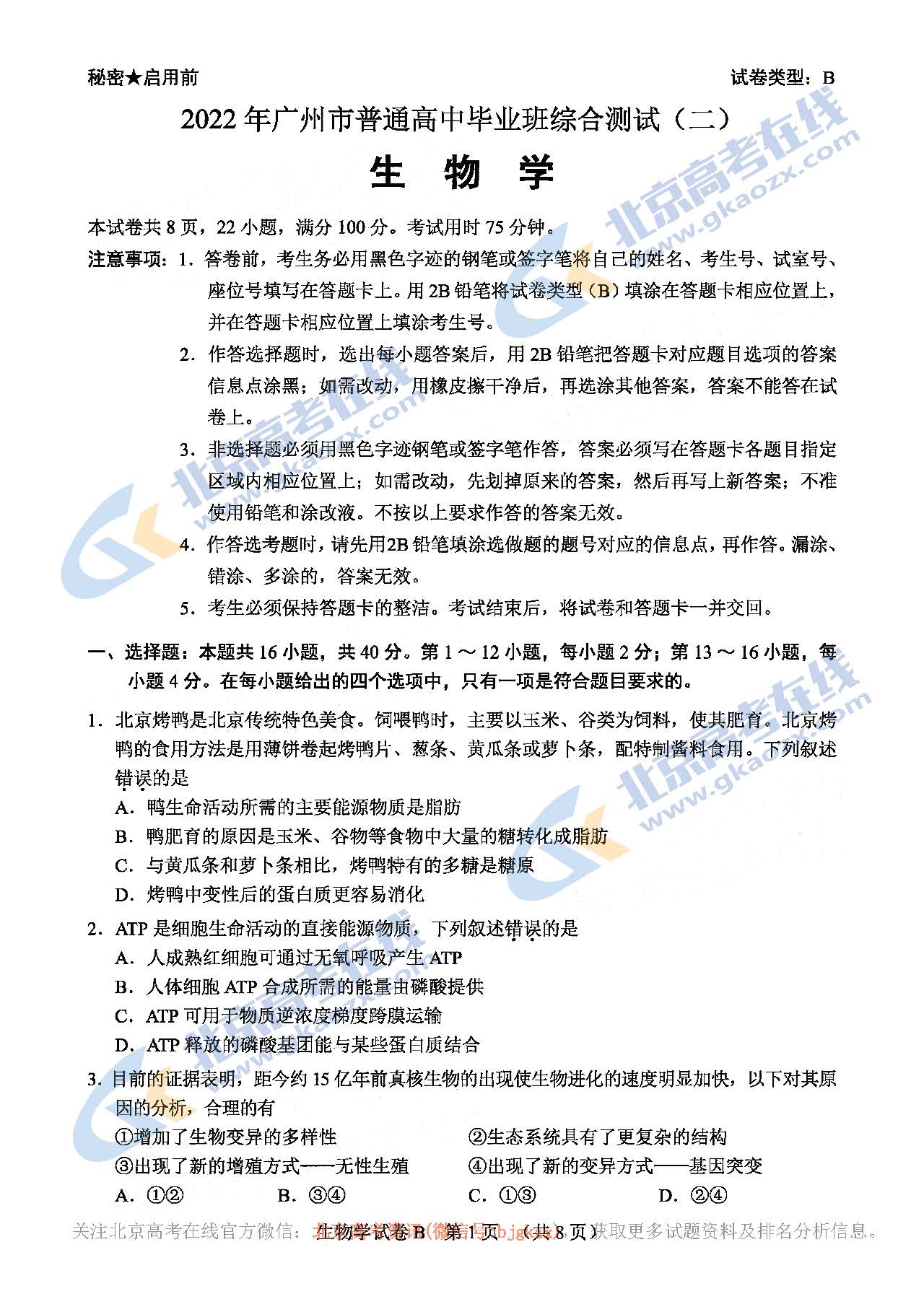 2022年广州二模生物科目考试已经结束。北京高考在线团队整理了2022年广州二模生物试题及答案,想要练习二模试题的考生可以下载学习啦!