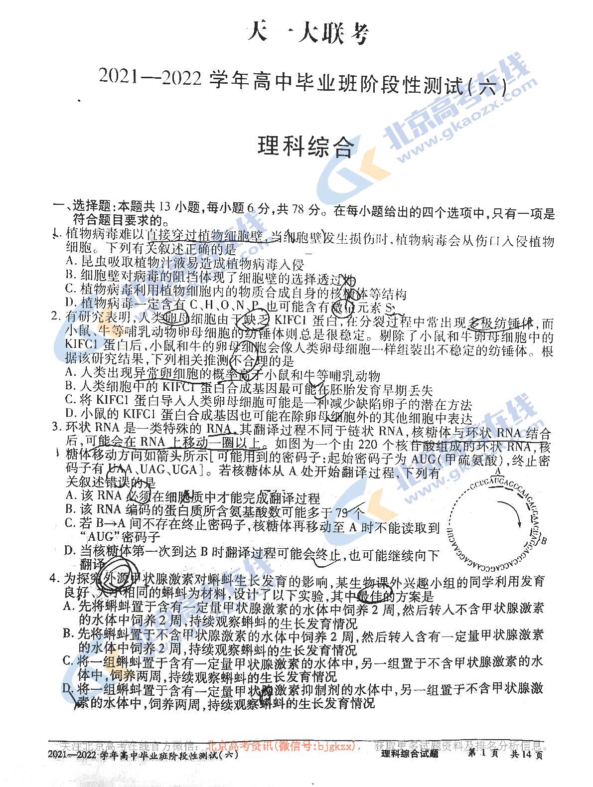 2022年天一大联考高三六联理综考试已结束。为了方便同学们查找相关试题,北京高考在线团队整理了2022年天一大联考高三六联理综试题及答案,欢迎同学们在线下载学习!