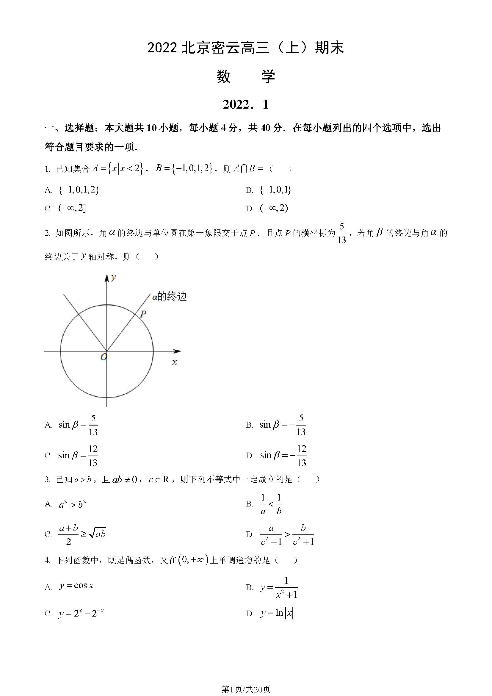 立即下载:北京密云区2022年高三上学期期末数学试题及答案