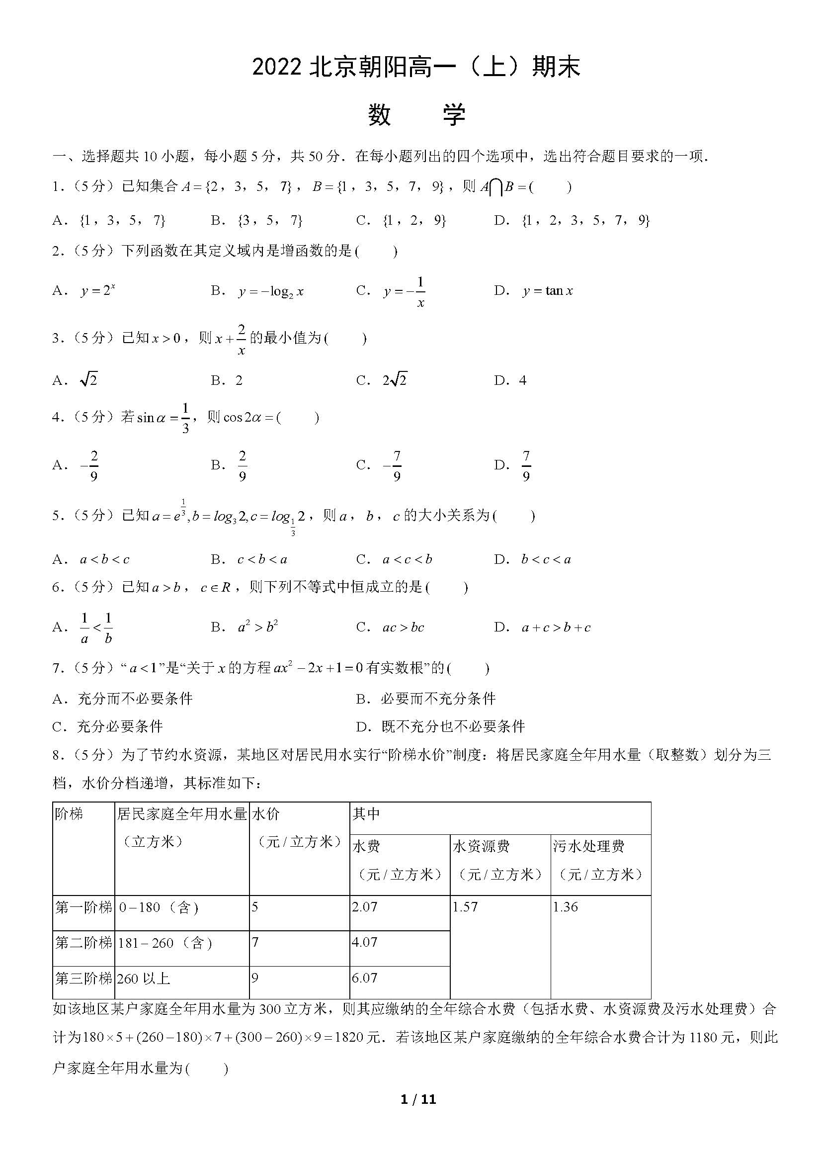 立即下载:2022北京朝阳区高一(上)期末数学试题及答案