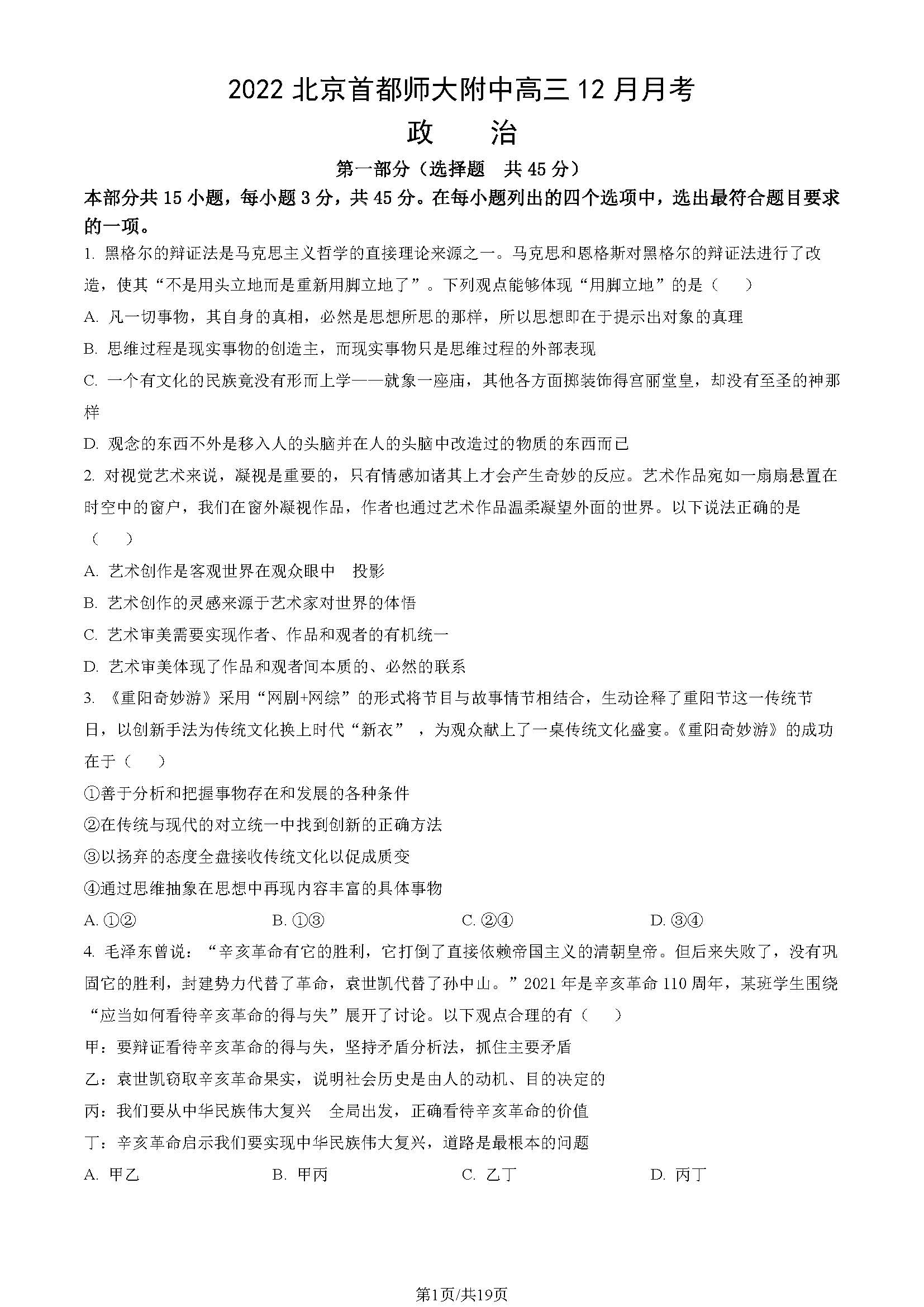2023北京首师大附中高三12月月考政治试题及答案下载