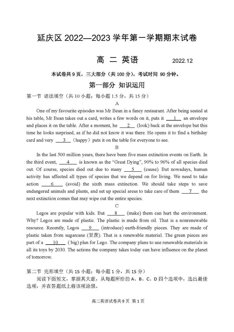 2023北京延庆期末考试已陆续开始,为了方便同学们查找相关试题,北京高考在线团队整理了延庆区高二上学期期末英语试题及答案,附高清电子版,欢迎为大家下载分享~