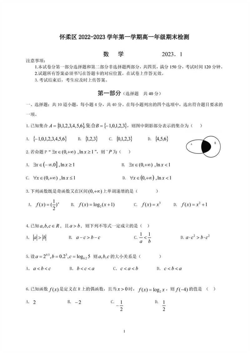 立即下载:2023年北京市怀柔区高一上学期期末数学试题及答案