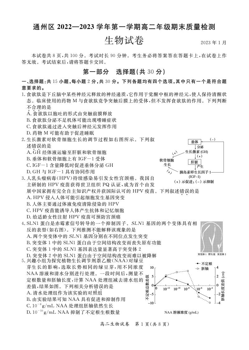 2023北京通州区高二上学期期末生物试题及答案