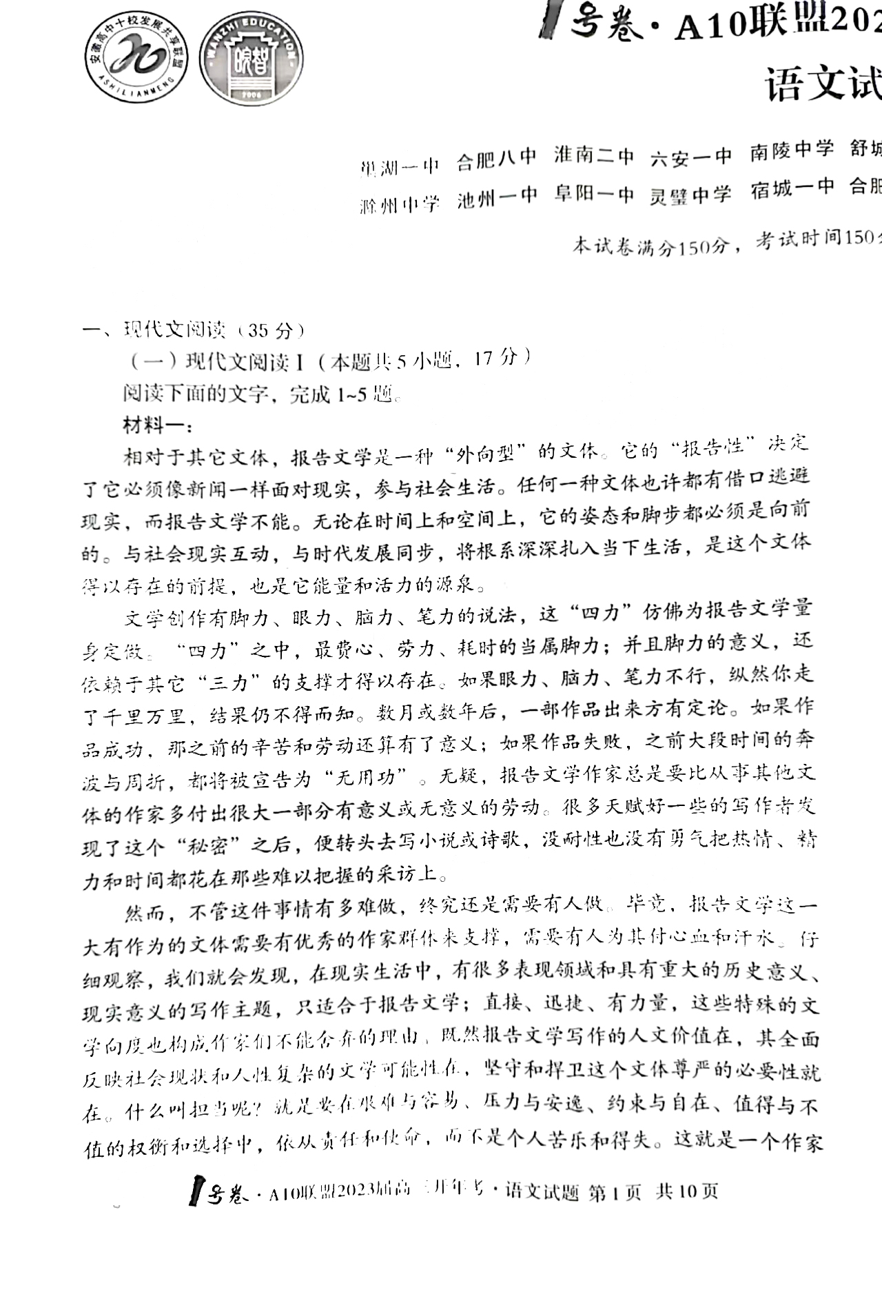 立即下载:2023安徽A10联盟高三开年考语文试题及答案