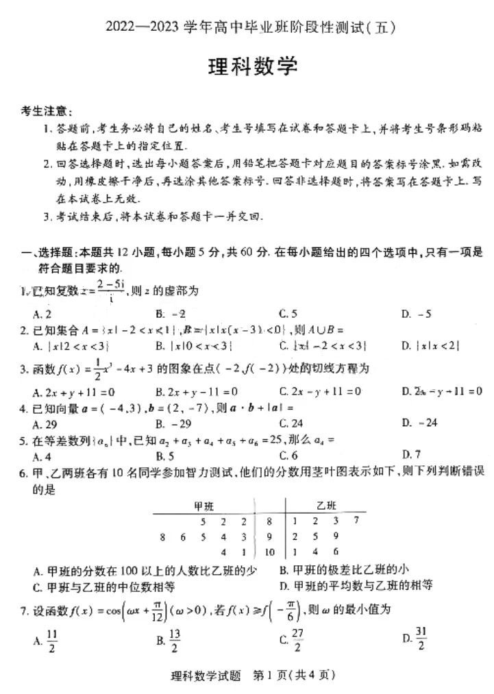 立即下载:2023天一大联考高三阶段性测试(五)理数试题及答案