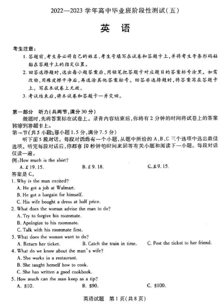 2023天一大联考高三阶段性测试(五)英语试题及答案