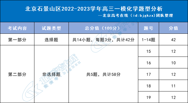 2023年北京石景山区高三一模考试已结束,为了方便同学们了解科目题型情况,北京高考在线团队特意对化学科目题型进行了简要分析,详情如下: