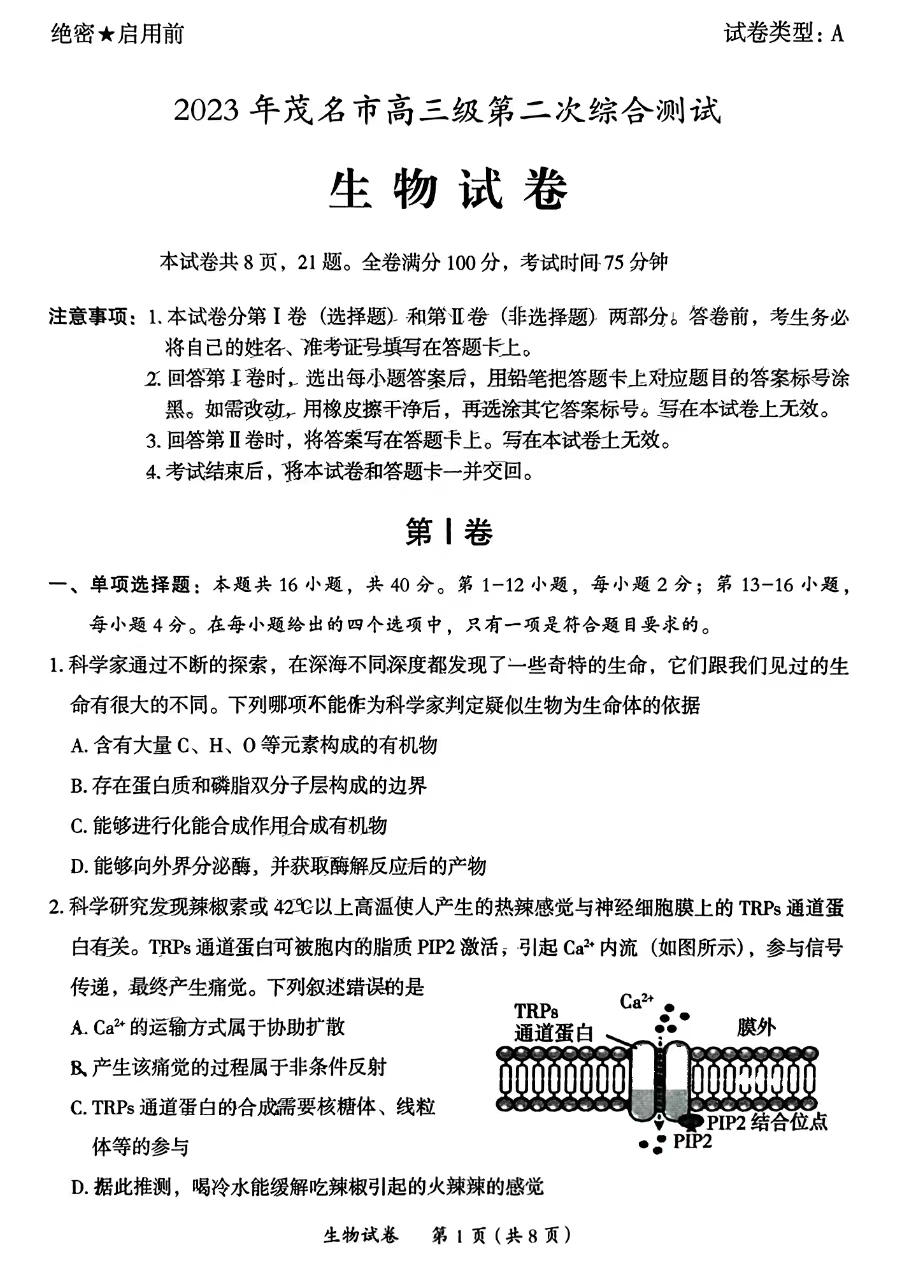 立即下载:2023广东茂名二模(高三)生物试题及答案