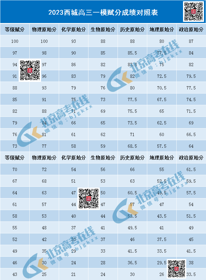 2023西城高三一模考试已结束,北京高考在线团队整理了6科选考科目赋分成绩对照表,供大家参考。详情如下: