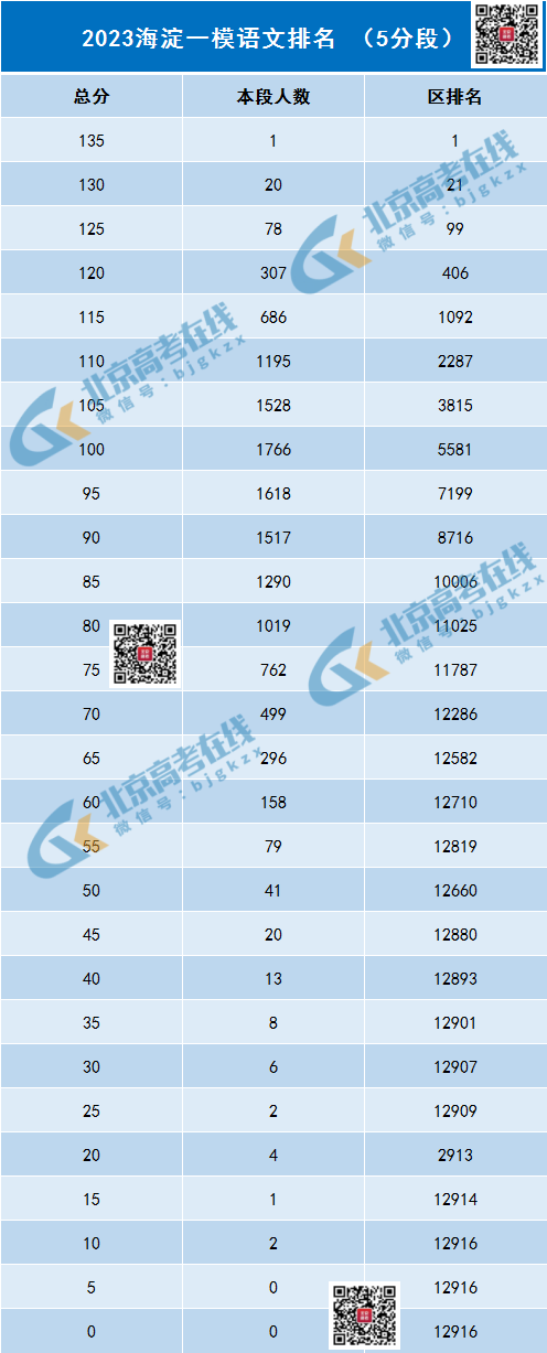 2023海淀区高三一模考试已结束,今年语文科目5分段排名情况如何?为此,北京高考在线团队特意搜集整理了语文单科5分段排名数据,详情如下: