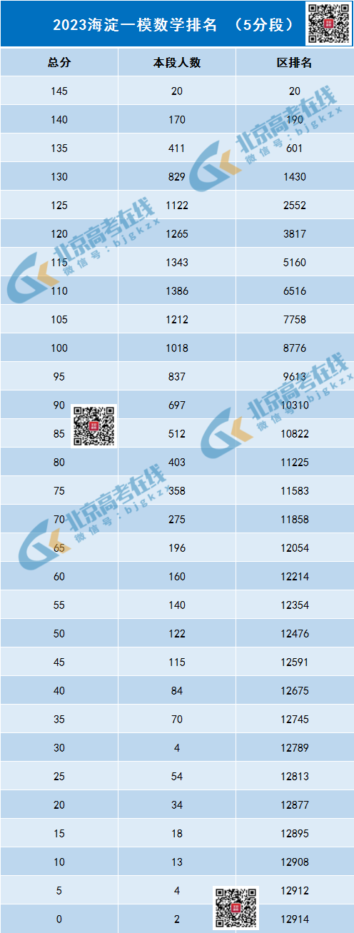 2023海淀区高三一模考试已结束,今年数学科目5分段排名情况如何?为此,北京高考在线团队特意搜集整理了数学单科5分段排名数据,详情如下: