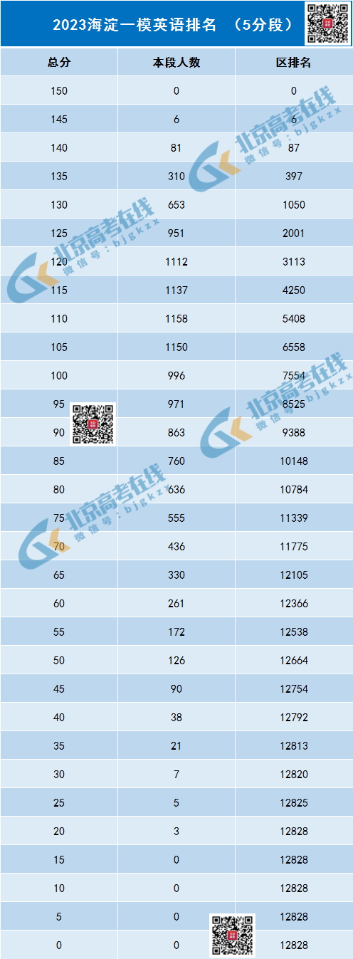 2023海淀区高三一模考试已结束,今年英语科目5分段排名情况如何?为此,北京高考在线团队特意搜集整理了英语单科5分段排名数据,详情如下: