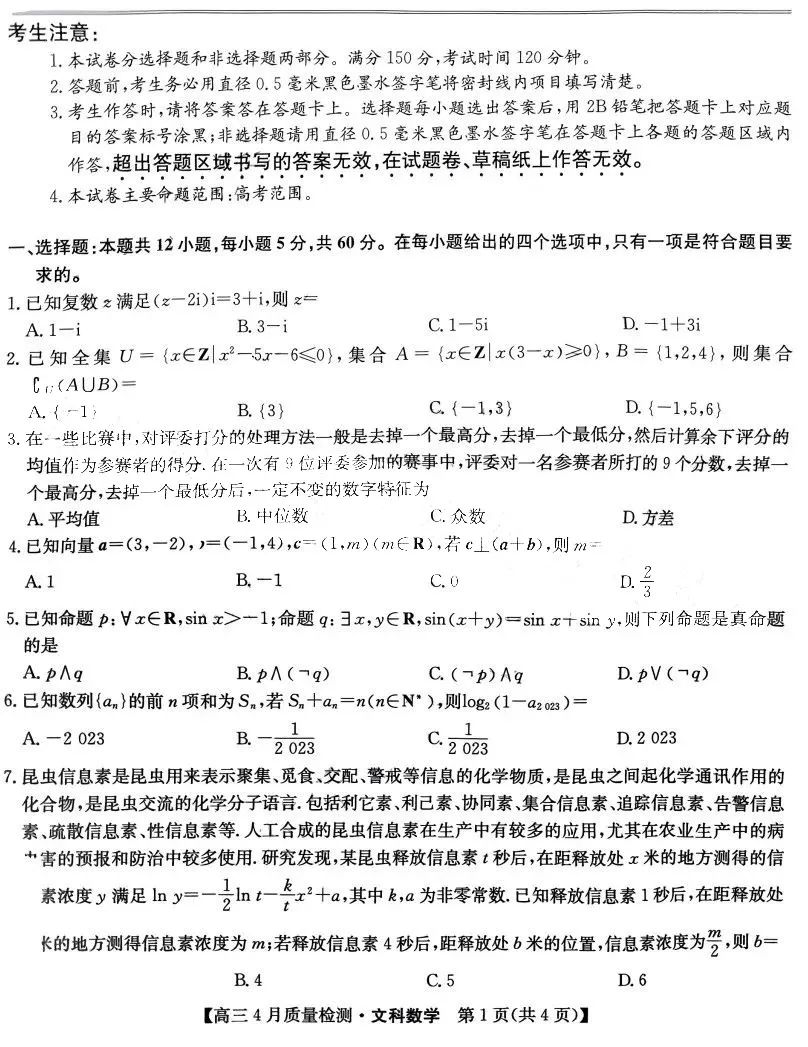 2023九师联盟高三4月联考文科数学试题及答案(全国卷)