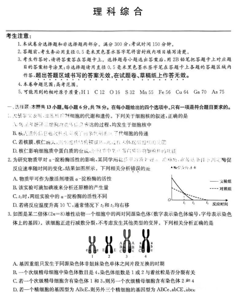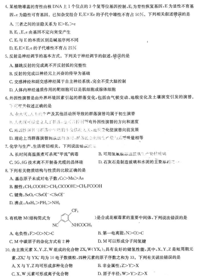 2023九师联盟高三4月联考理综试题及答案(全国卷)