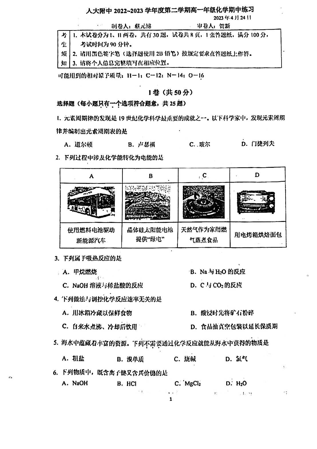 2022-2023学年北京各区高一年级下学期期中考试已结束,北京高考在线团队整理了人大附中高一(下)期中化学试题及答案,供同学们在线下载!