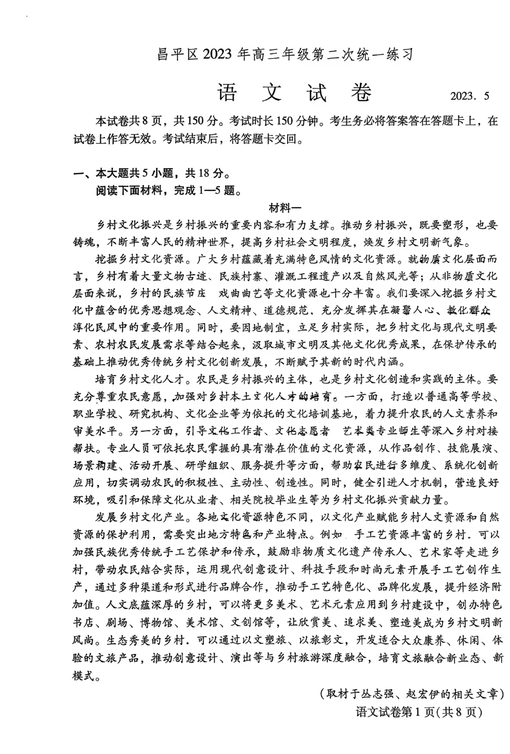 立即下载:2023年北京昌平高三二模语文试题及答案