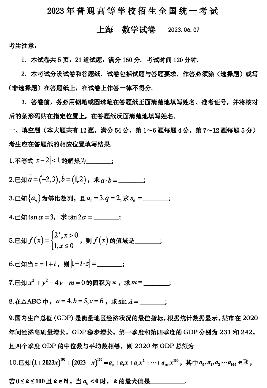 立即下载:2023高考上海卷数学试题