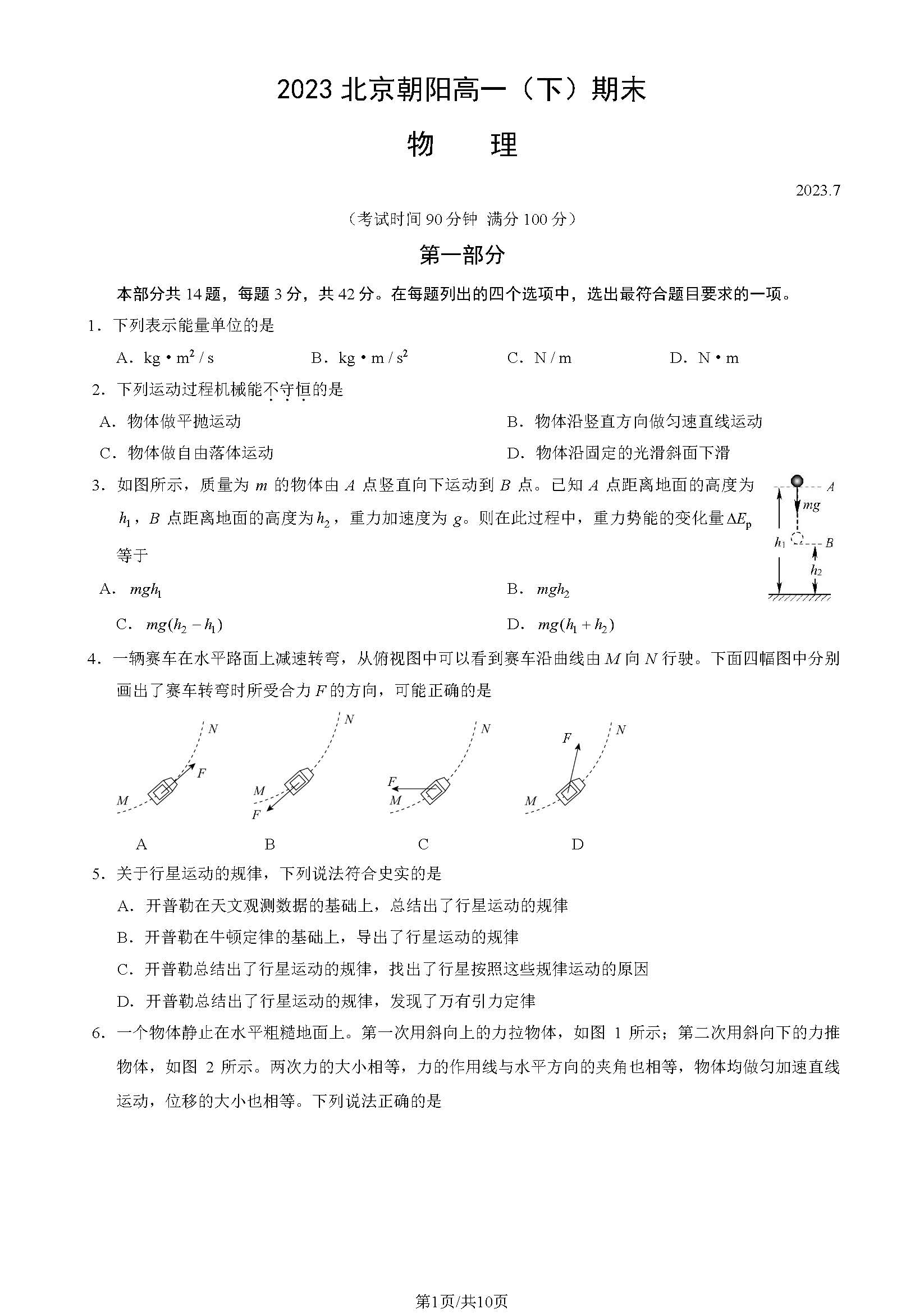 2022-2023学年北京朝阳区高一下学期期末物理试题及答案