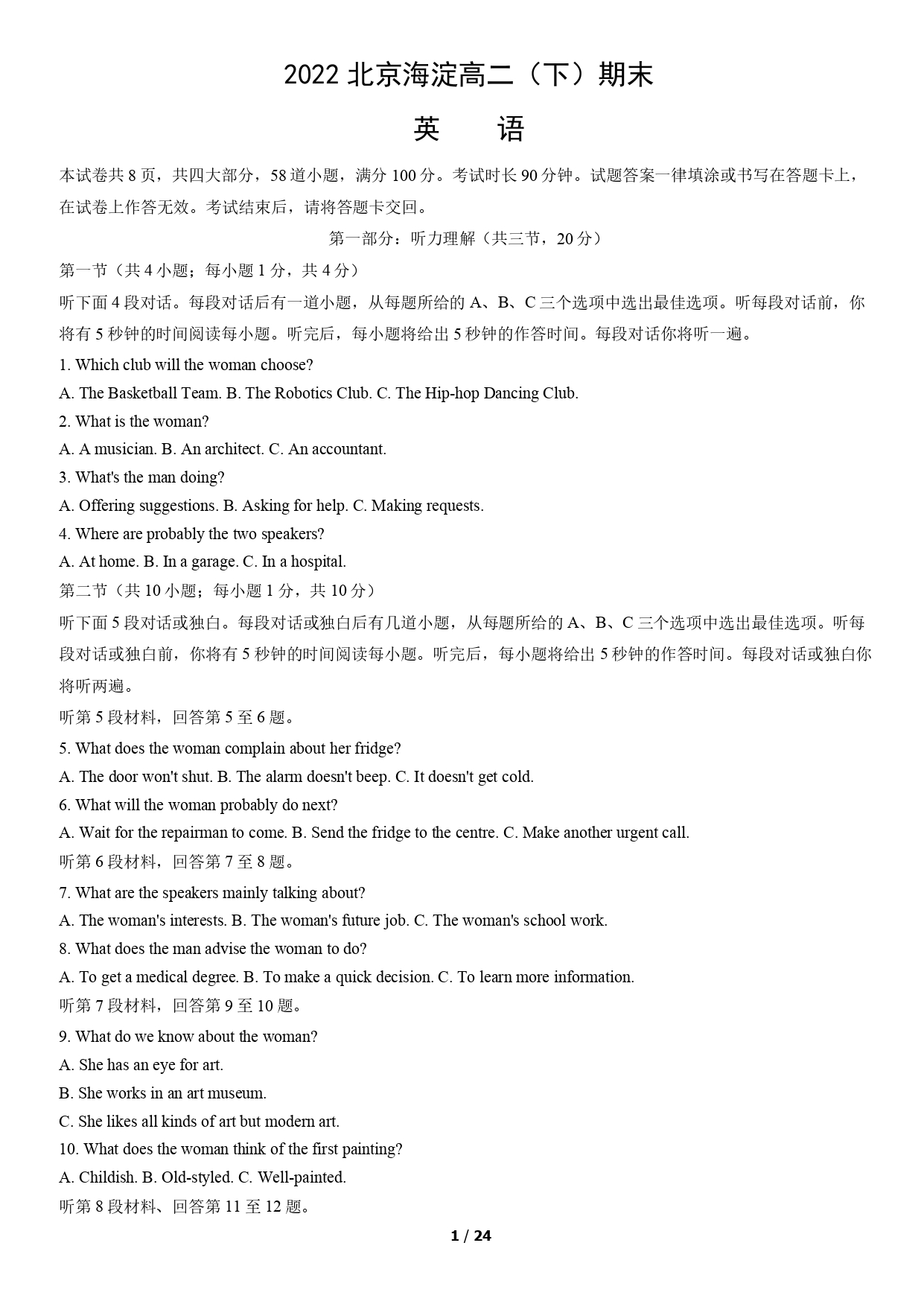2021-2022学年北京海淀区高二下学期期末英语试题及答案