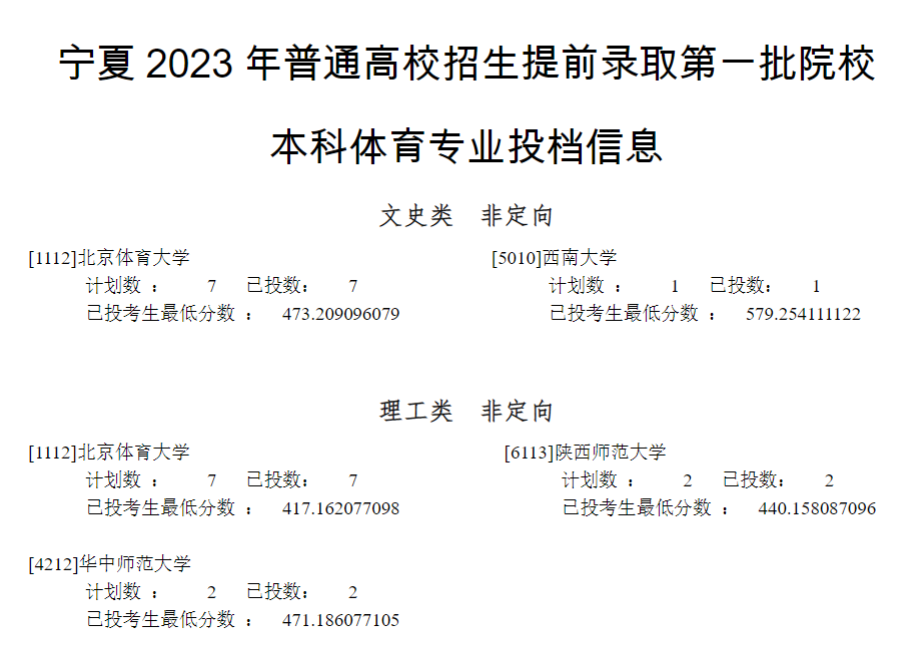 2023年宁夏高考招生提前录取第一批院校本科体育专业投档分数线
