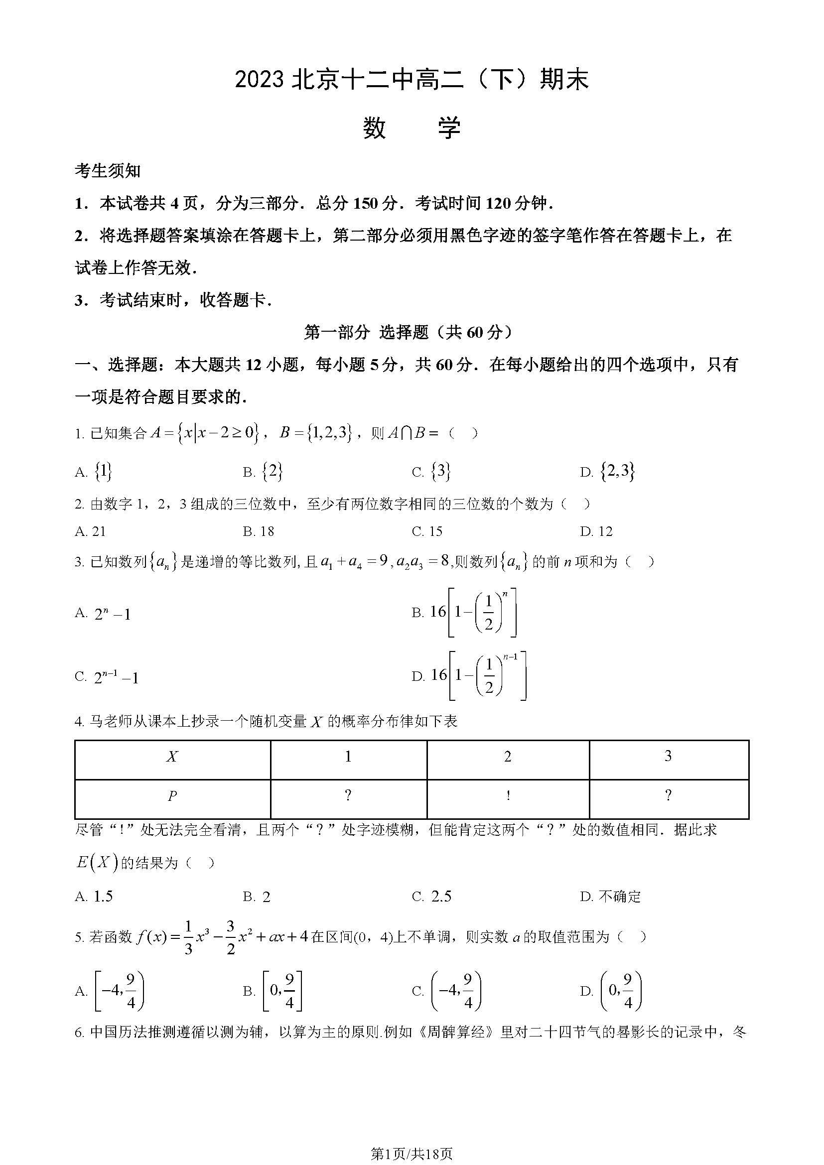立即下载:2022-2023学年北京丰台十二中高二下学期期末数学试题及答案