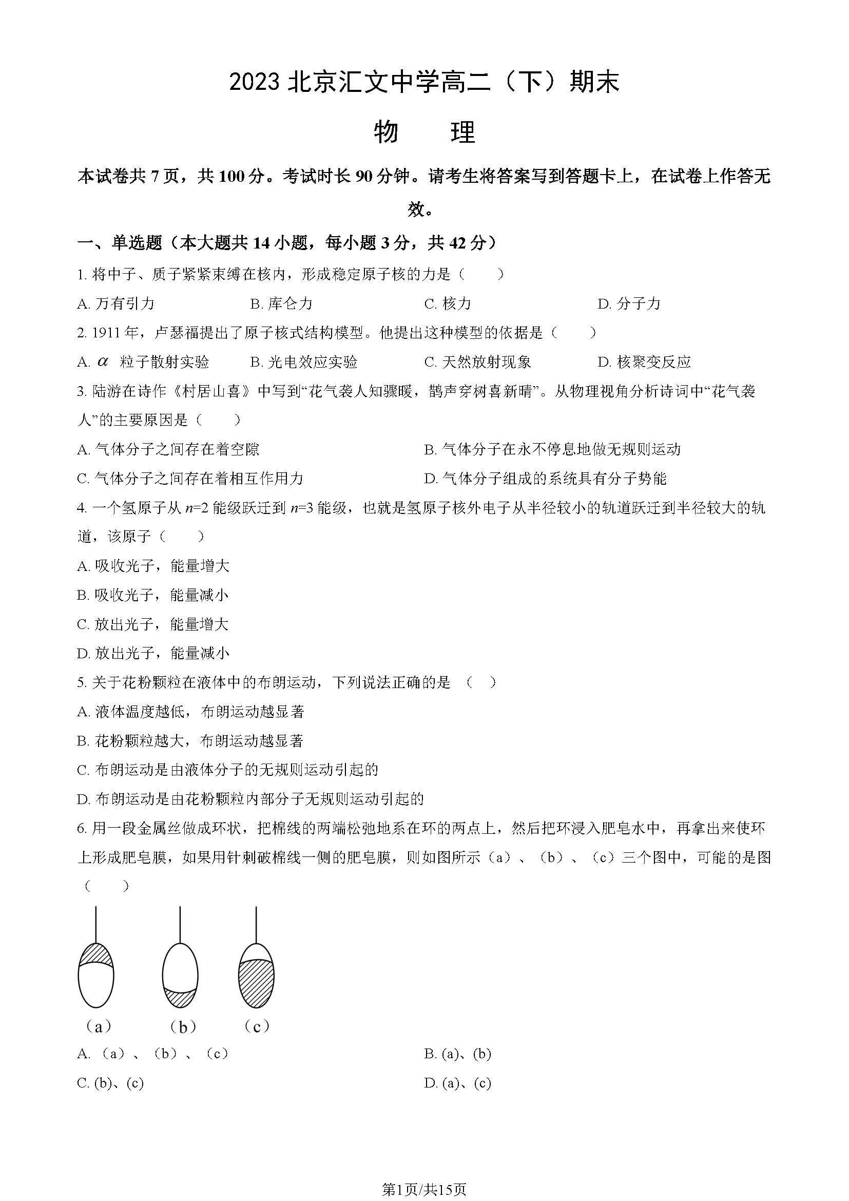 立即下载:2022-2023学年北京汇文中学高二下学期期末物理试题及答案