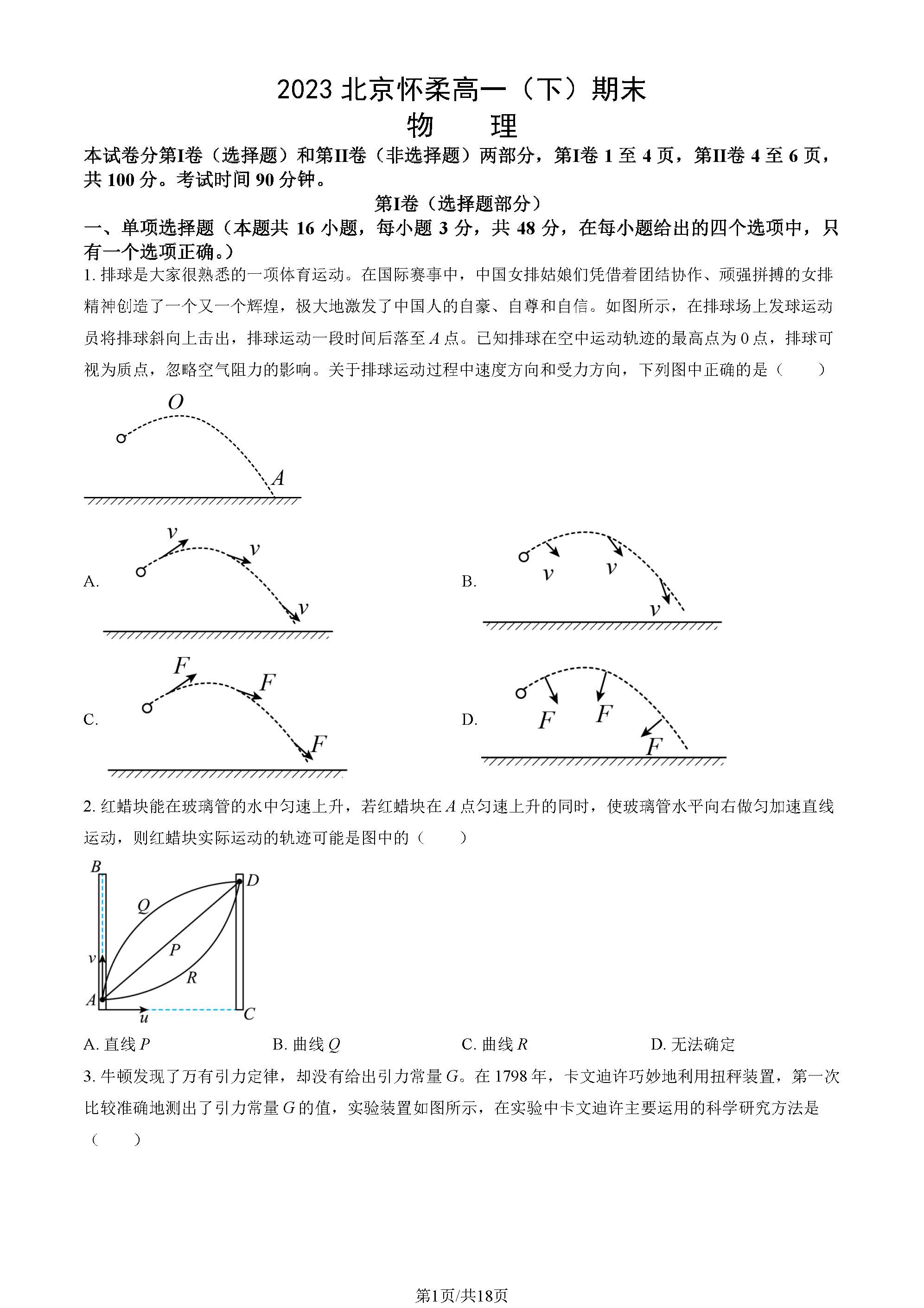 北京怀柔区2022-2023学年高一下学期期末已于7月进行,北京高考在线团队特意整理了物理科目试题及答案,提供给大家下载练习~