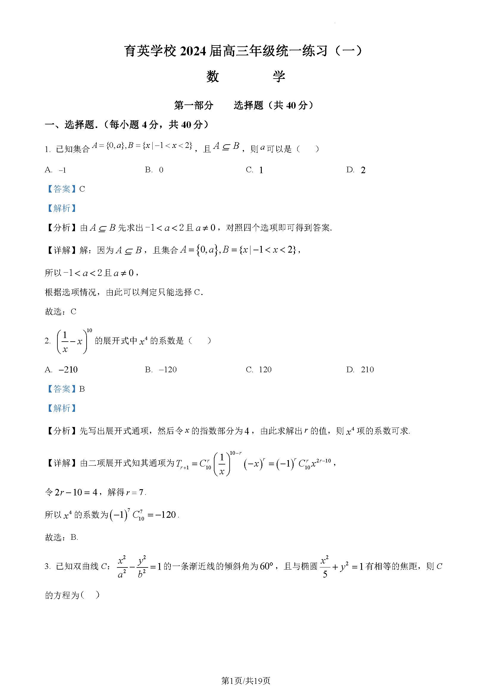 立即下载:2024届新高三北京育英学校开学考数学试题及答案(解析版)