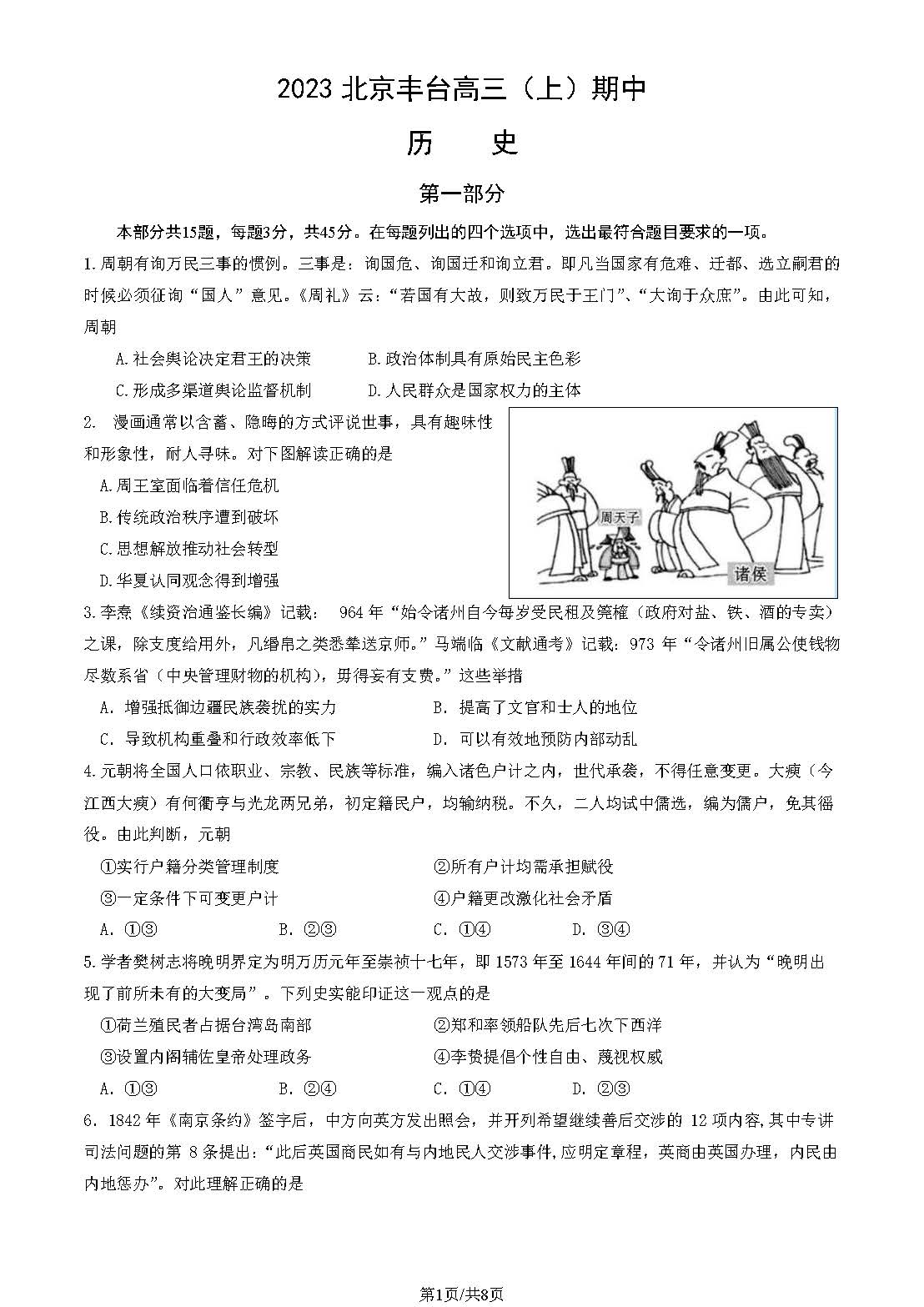 2023-2024学年北京丰台区高三期中历史试题及答案