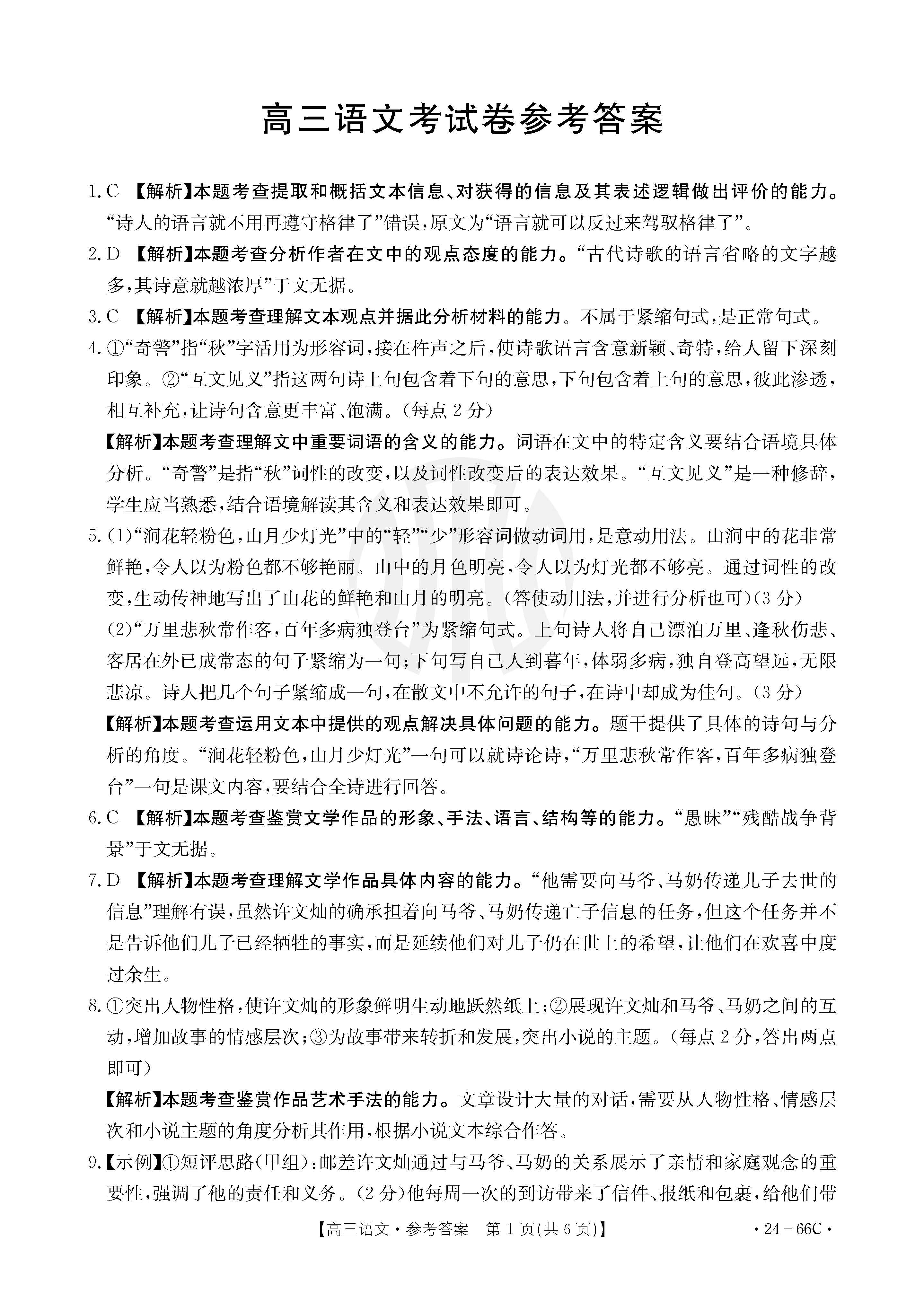 2024届云南金太阳高三10月联考语文答案(24-66C)