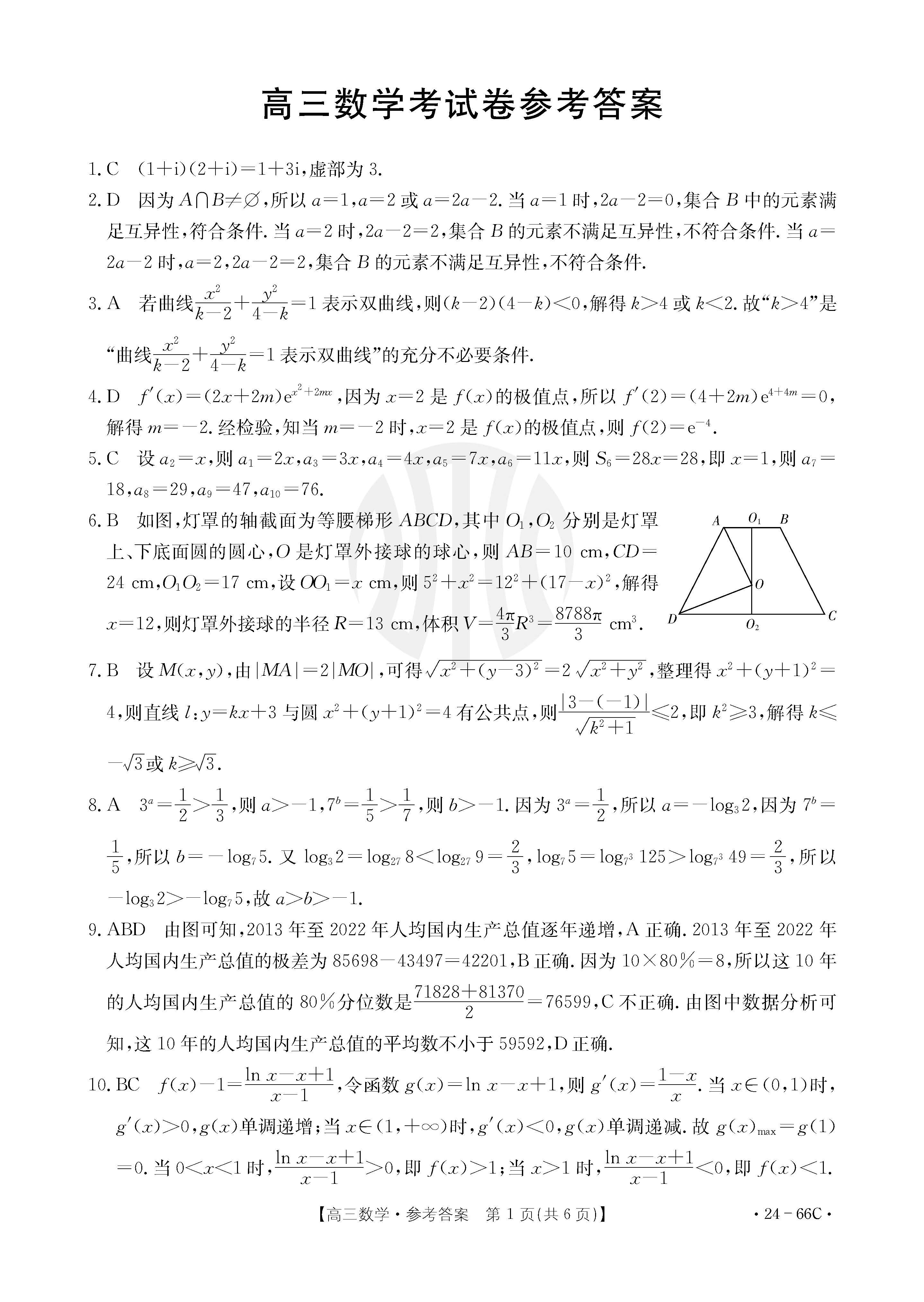 立即下载:2024届云南金太阳高三10月联考数学答案(24-66C)