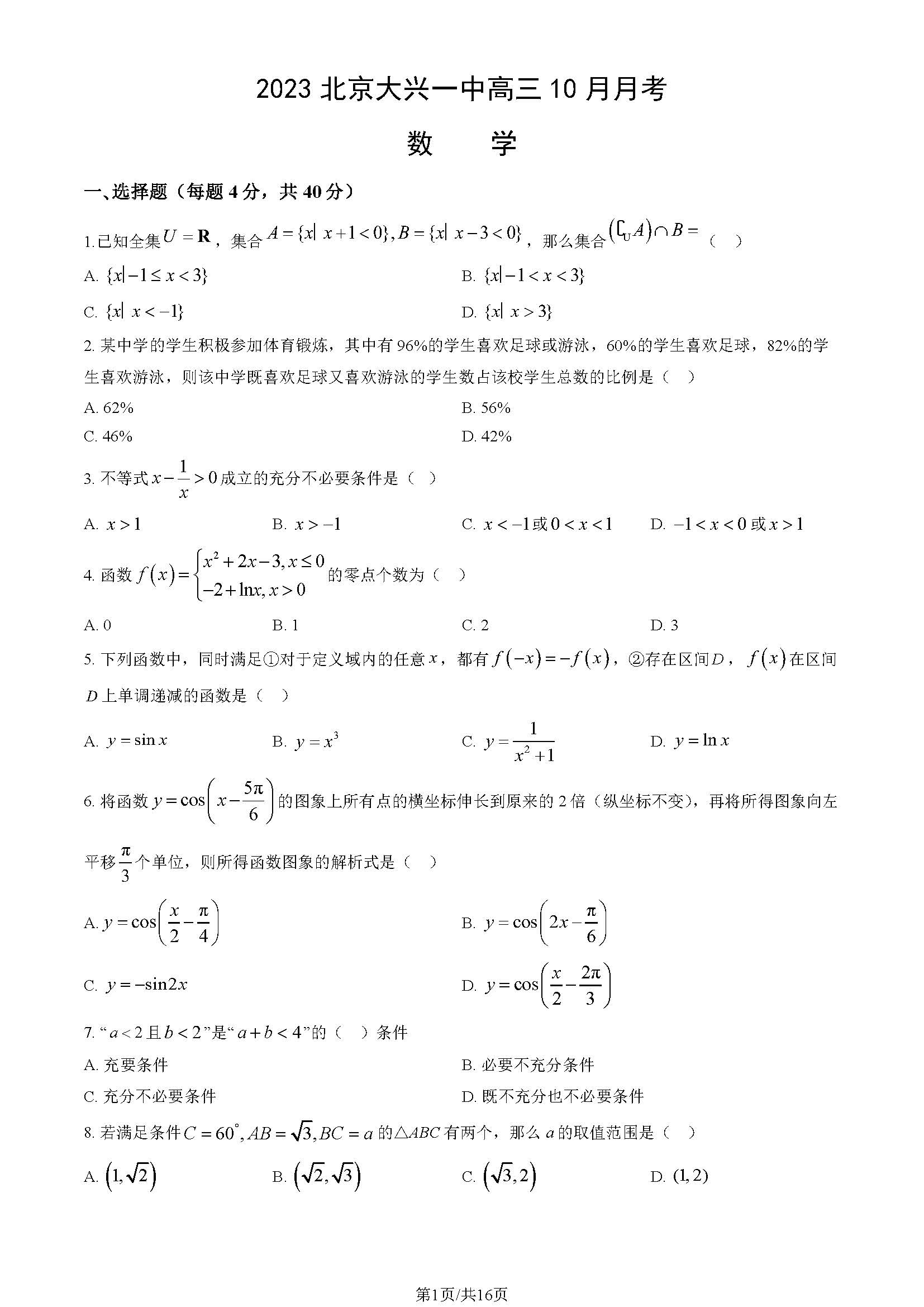 立即下载:北京大兴一中高三2023年10月月考数学试题及答案
