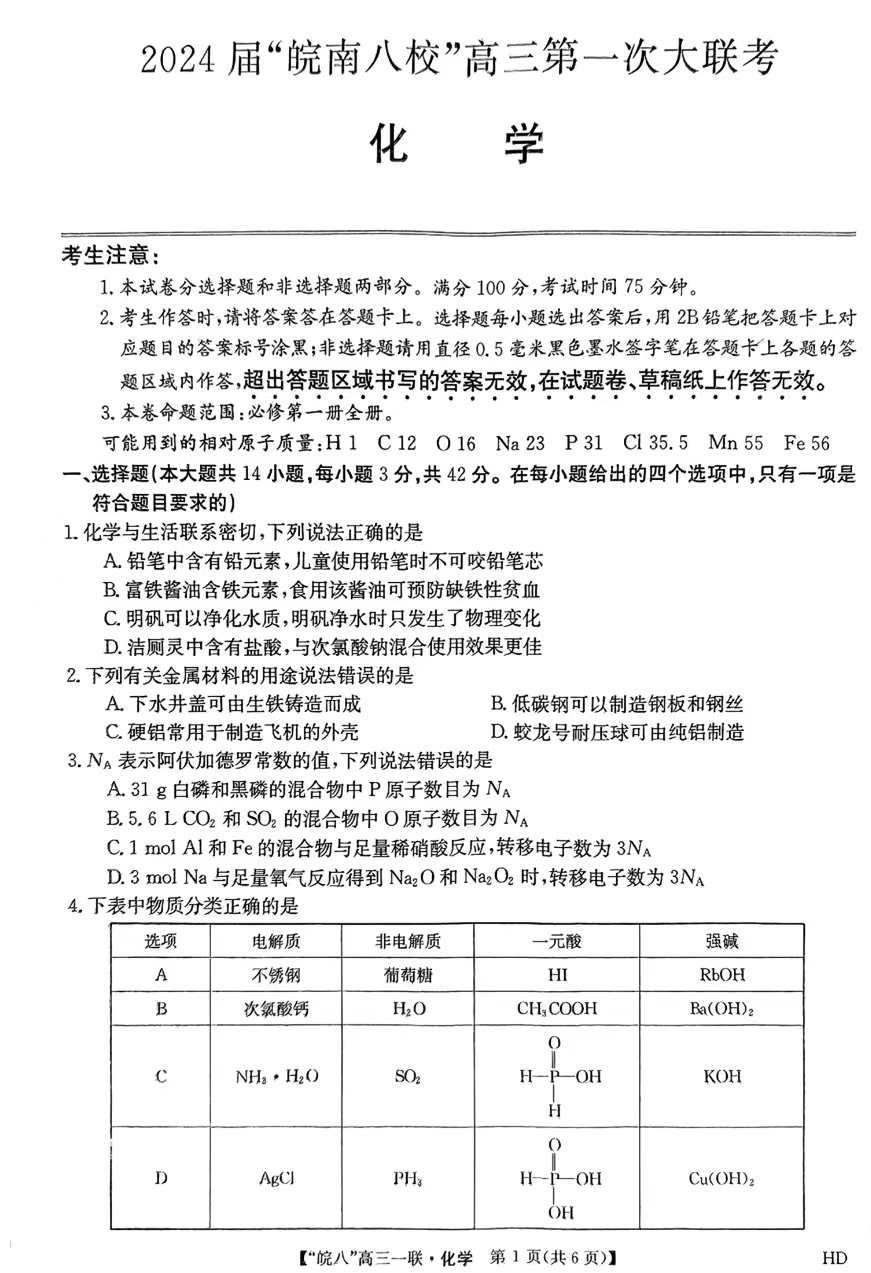 2024届皖南八校高三第一次大联考化学试题及答案