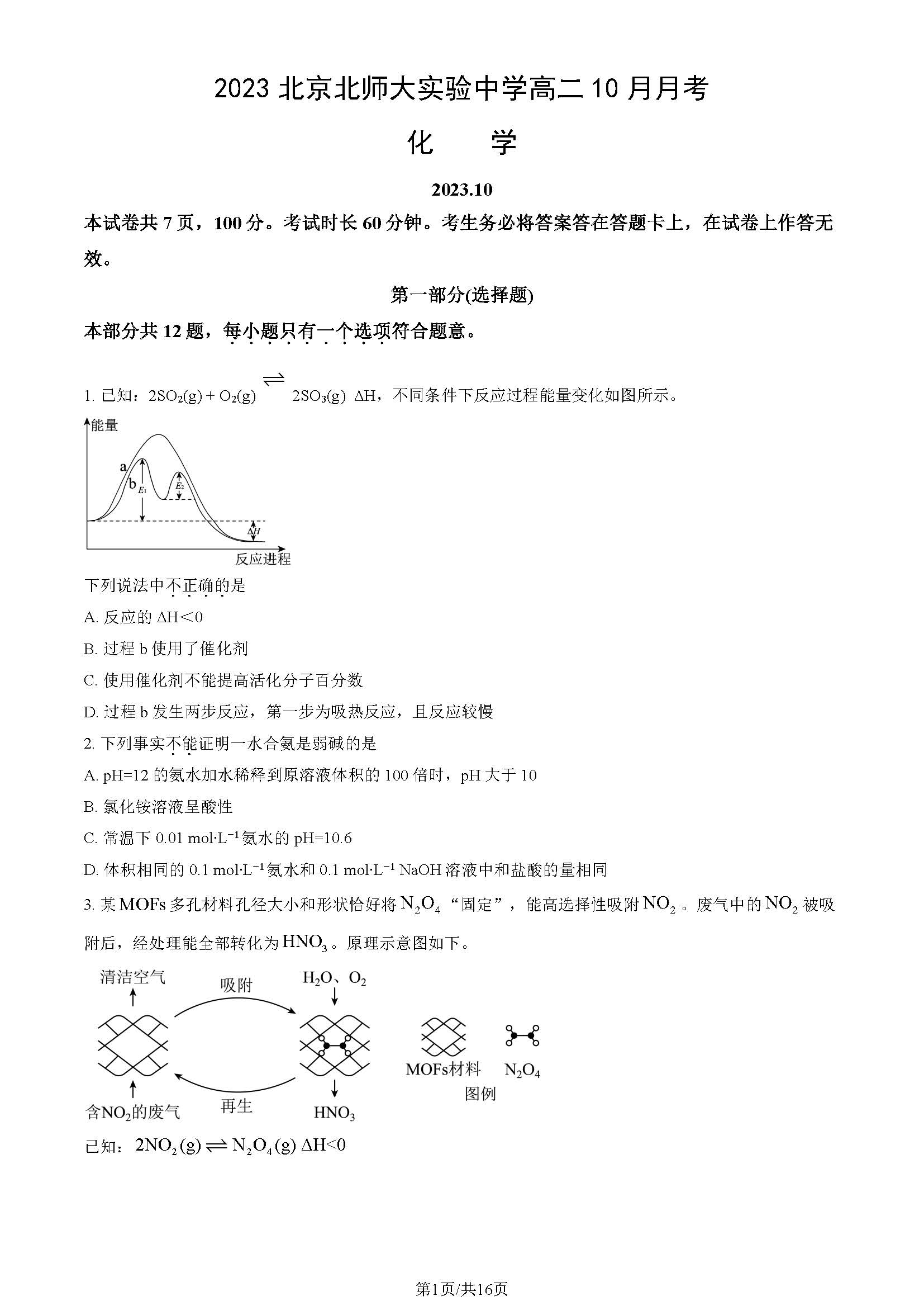 立即下载:2023北京北师大实验中学高二10月月考化学试题及答案
