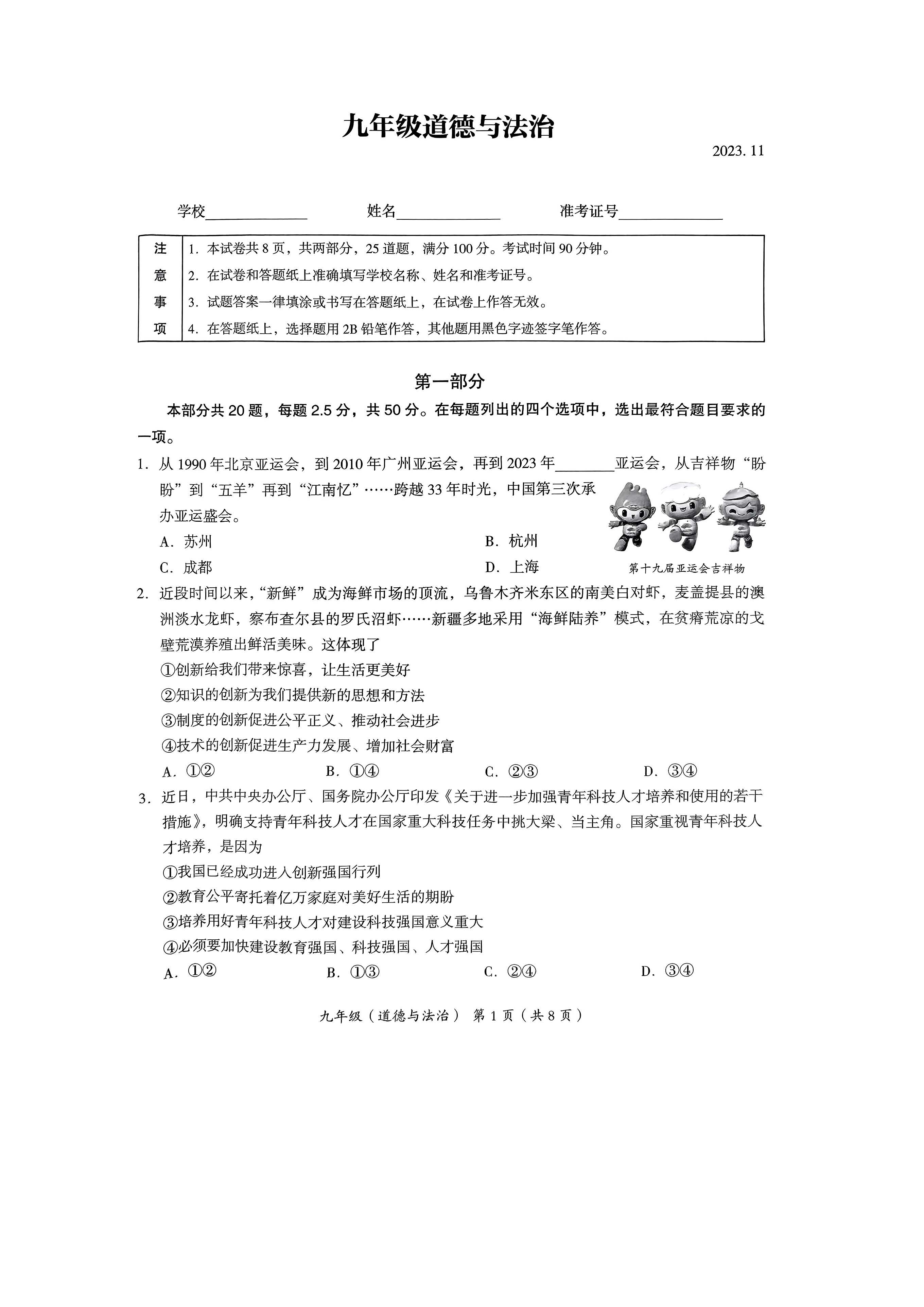 2023-2024学年北京海淀区初三期中道德与法治试题