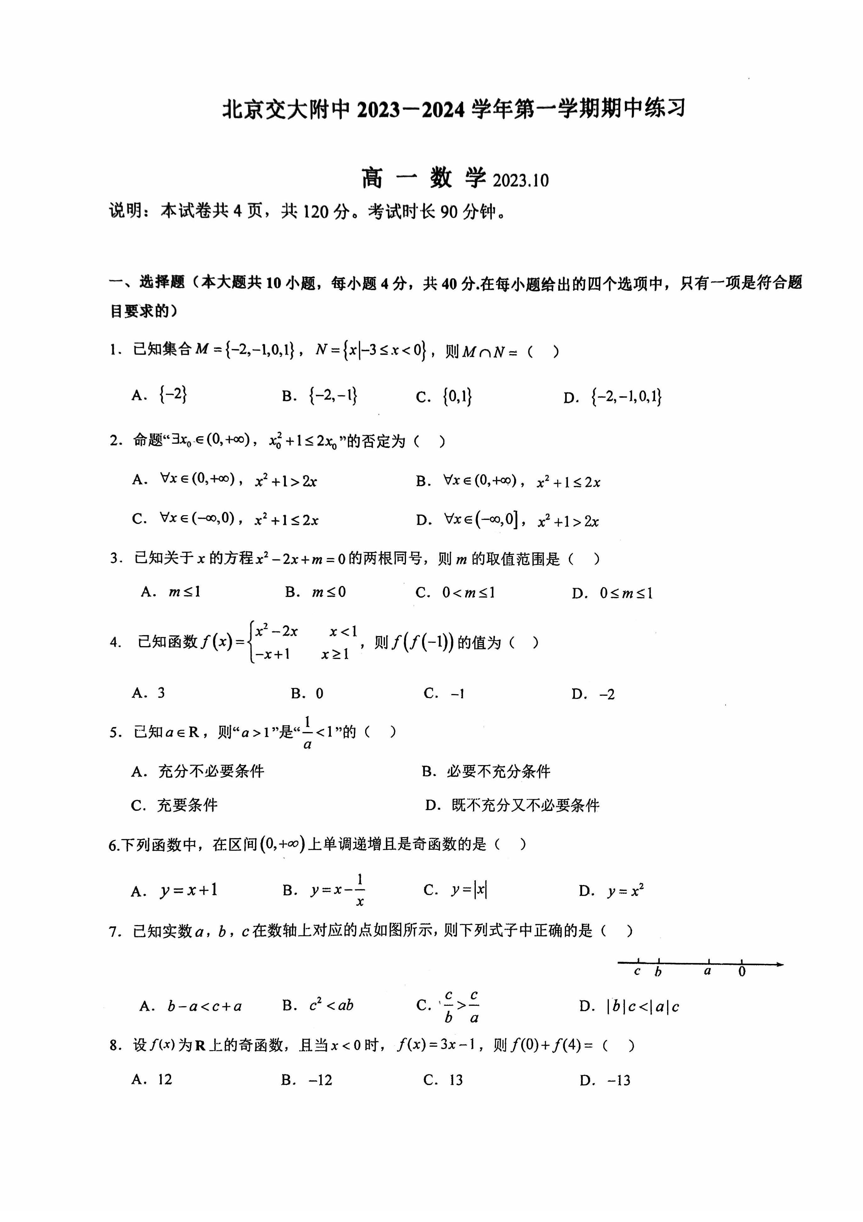 2023-2024学年北京交通大学附属中学高一(上)期中数学试题及答案