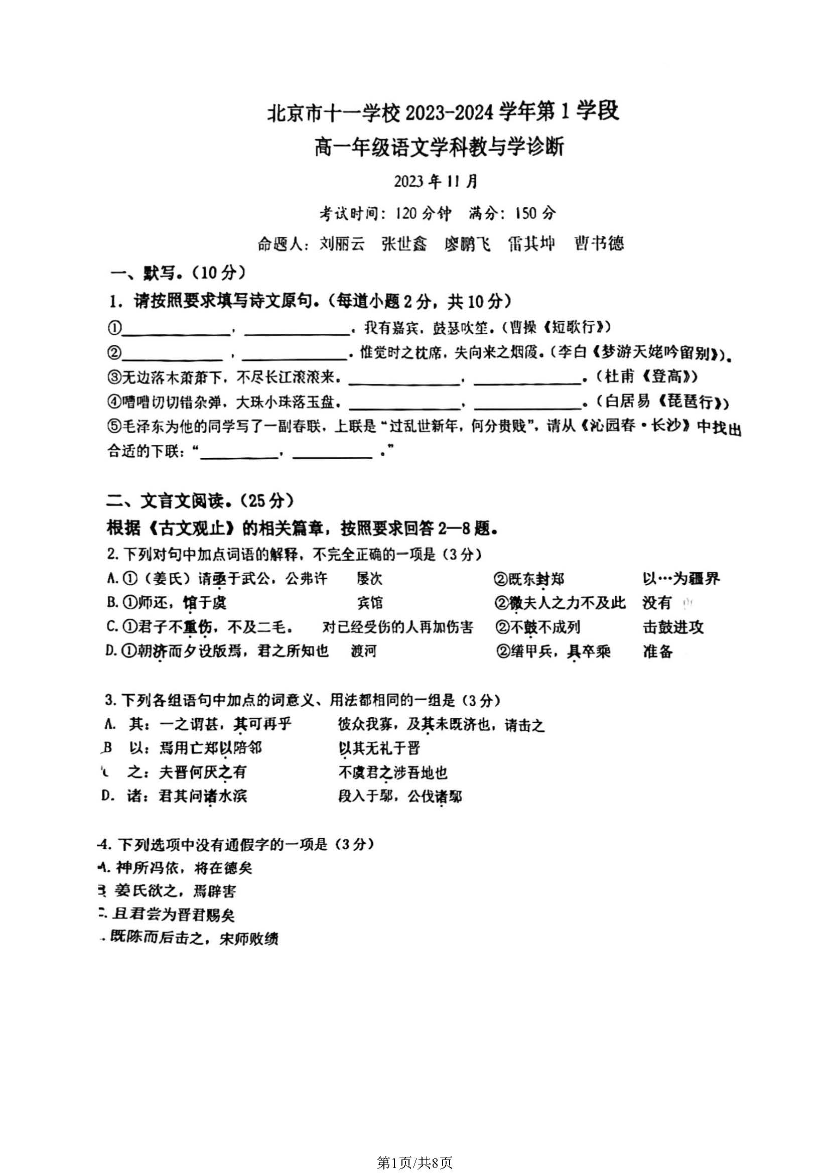 2023-2024学年北京十一学校高一(上)期中语文试题及答案