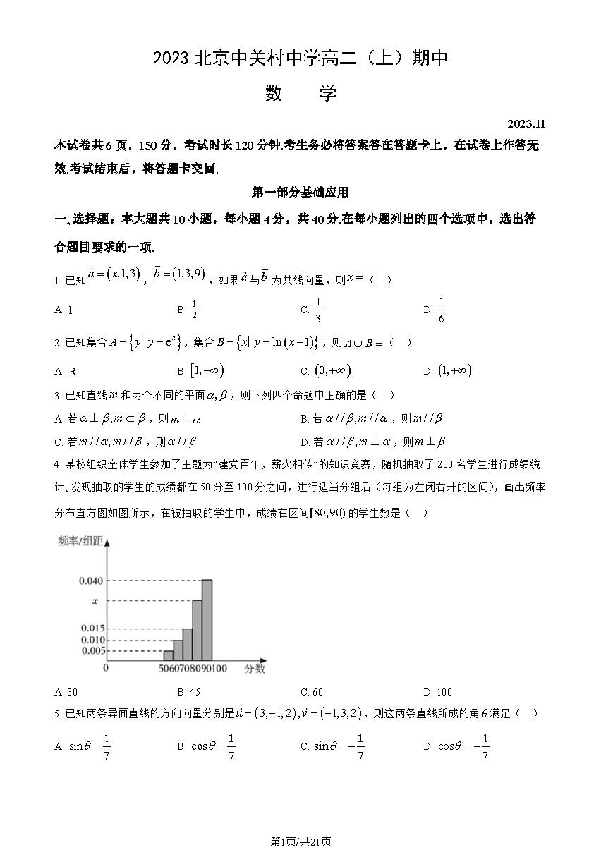 立即下载:2023-2024学年北京中关村中学高二(上)期中数学试题及答案