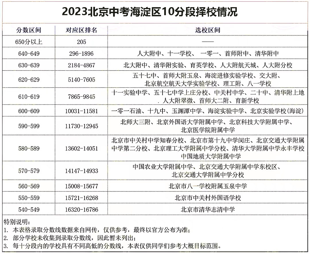 2023年北京海淀区初三期中考试已结束,本次期中考试语数英物政5科总分500分,根据目前收集到的数据,2023年海淀区录取分数线位于640-649的学校明显更多,有人大附中、十一学校、一零一中学、首师大附、清华附,属于六小强之一的北大附由于录取分数线为636,划到了下一个十分段。