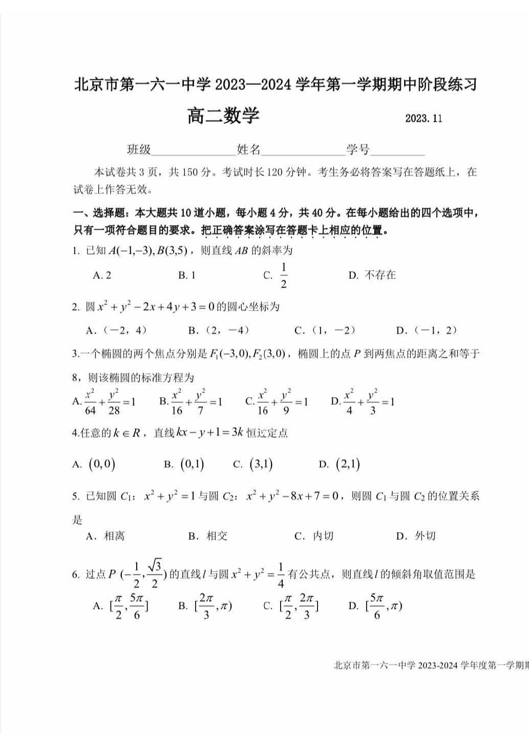 2023-2024学年一六一中学高二(上)期中数学试题及答案