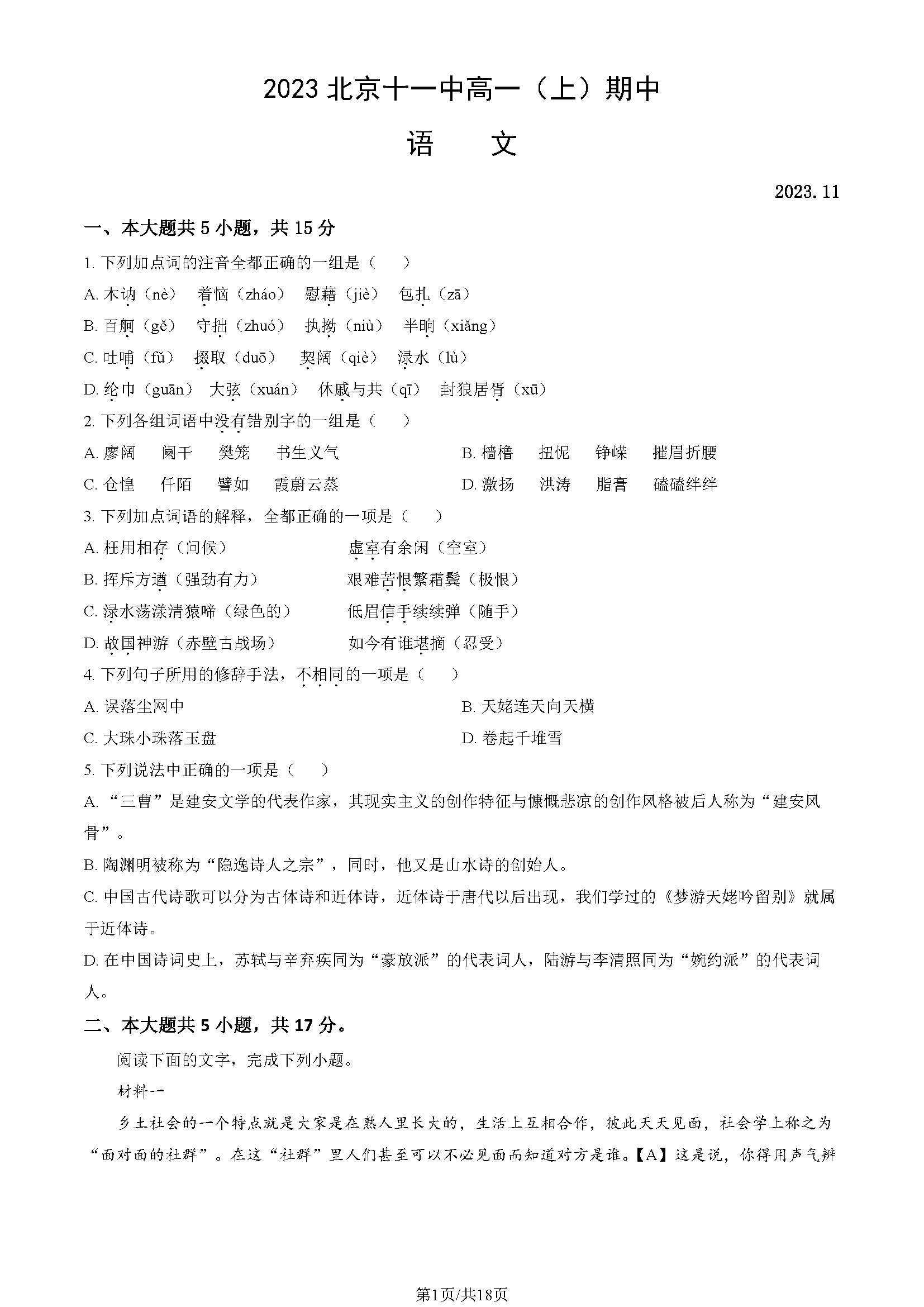 2023-2024学年北京十一中高一(上)期中语文试题及答案
