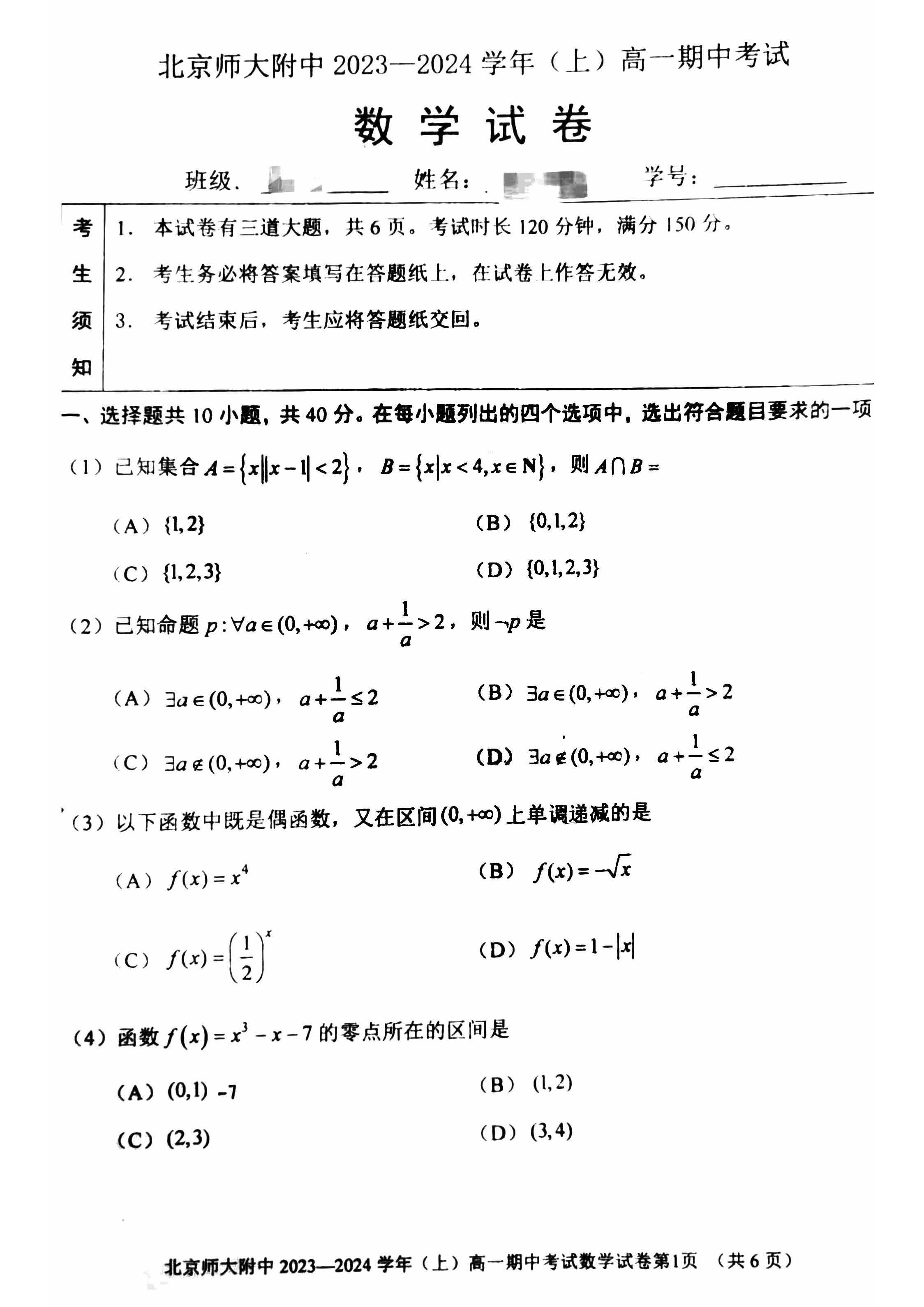 2023-2024学年北京师范大学附属中学高一(上)期中数学试题及答案