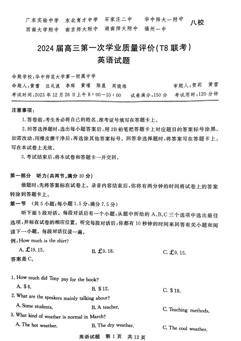 2024届高三第一次八省联考(T8联考)英语试题及答案