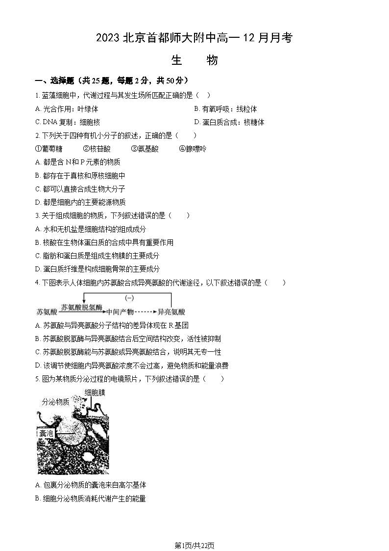 北京各区高一年级12月月考已开始,为此,北京高考在线团队整理了2023首都师范大学附属中学高一12月月考生物试题及答案,供大家下载!