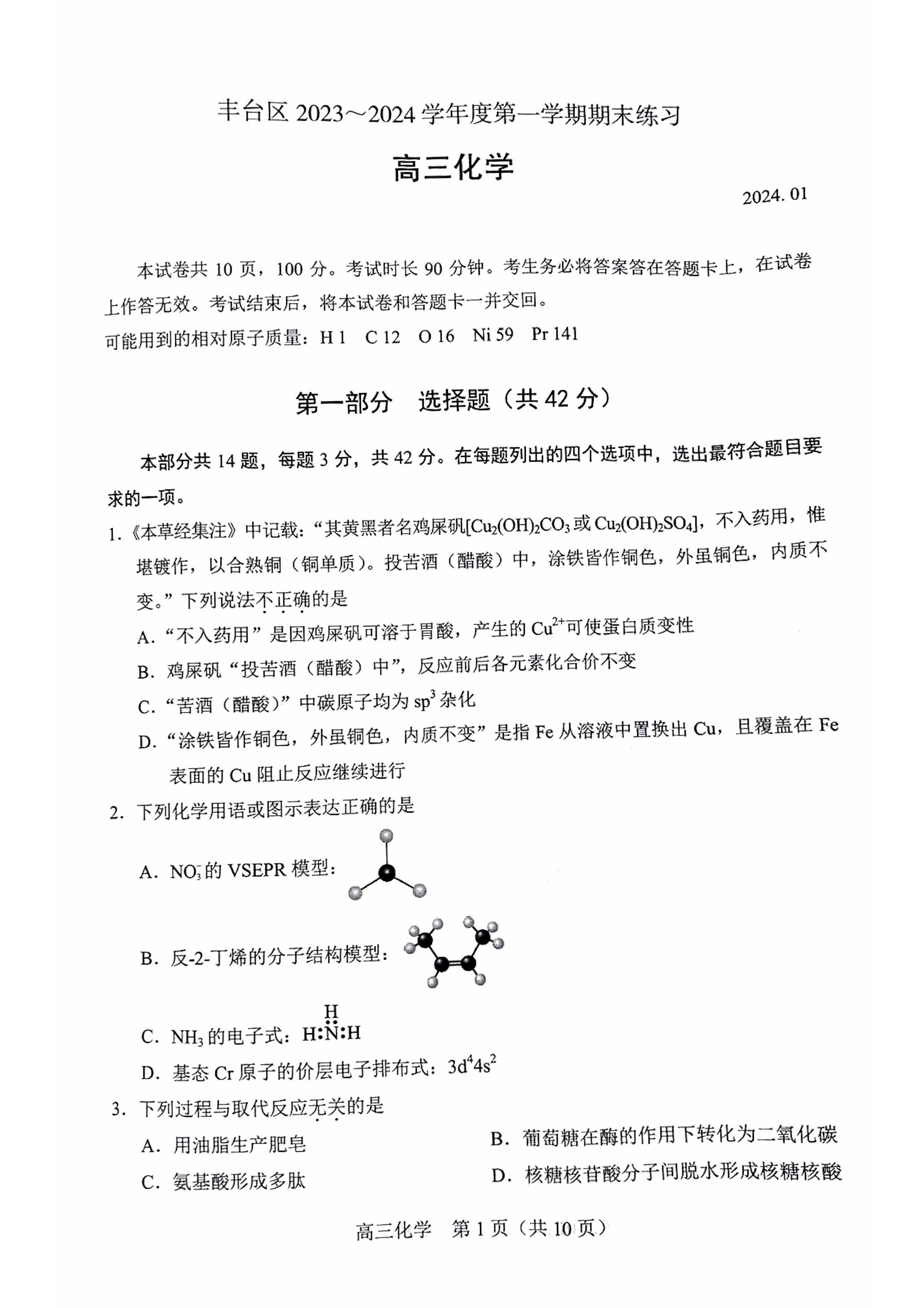 2023-2024学年北京丰台区高三期末化学试题及答案