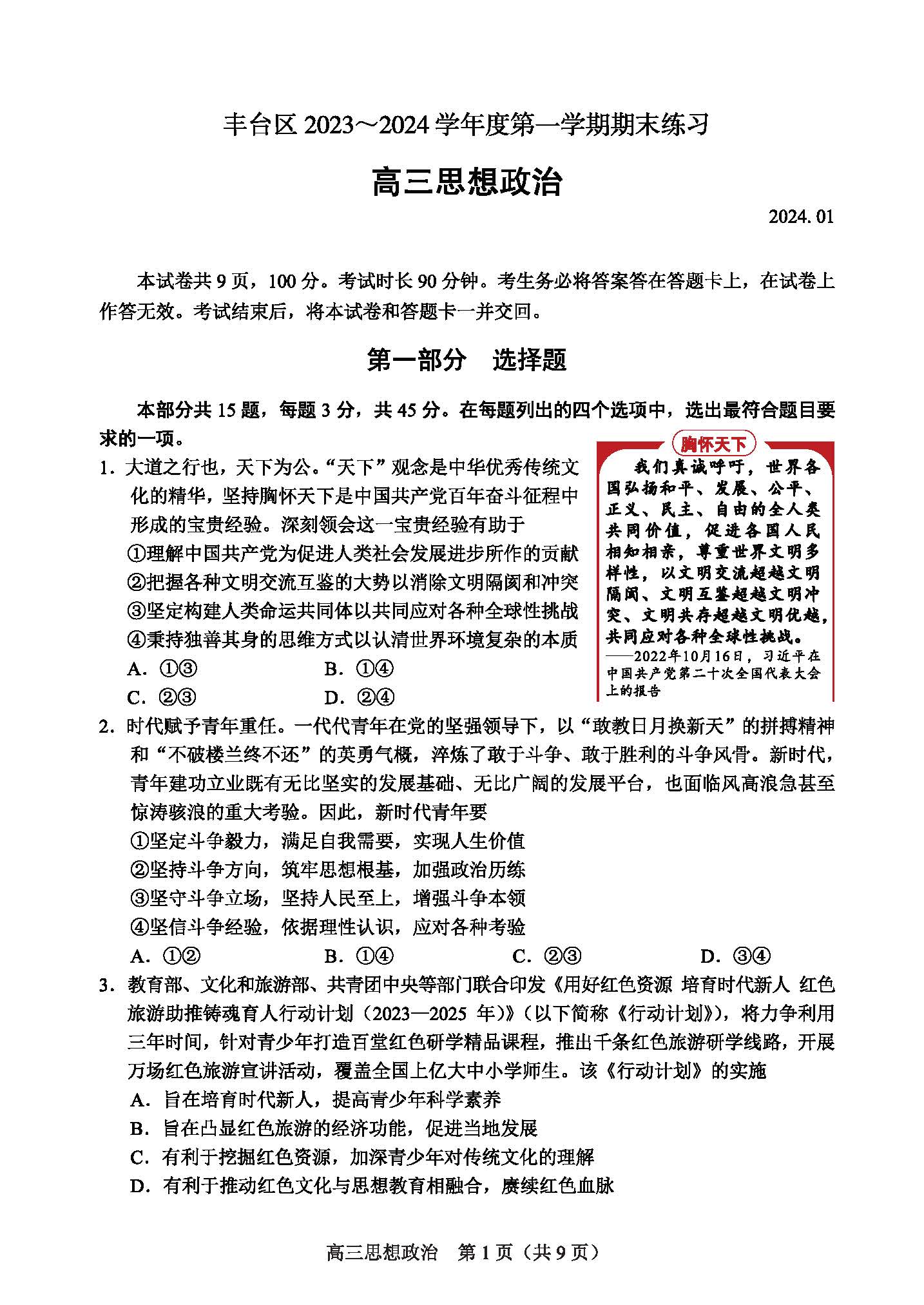 2023-2024学年北京丰台区高三期末政治试题及答案